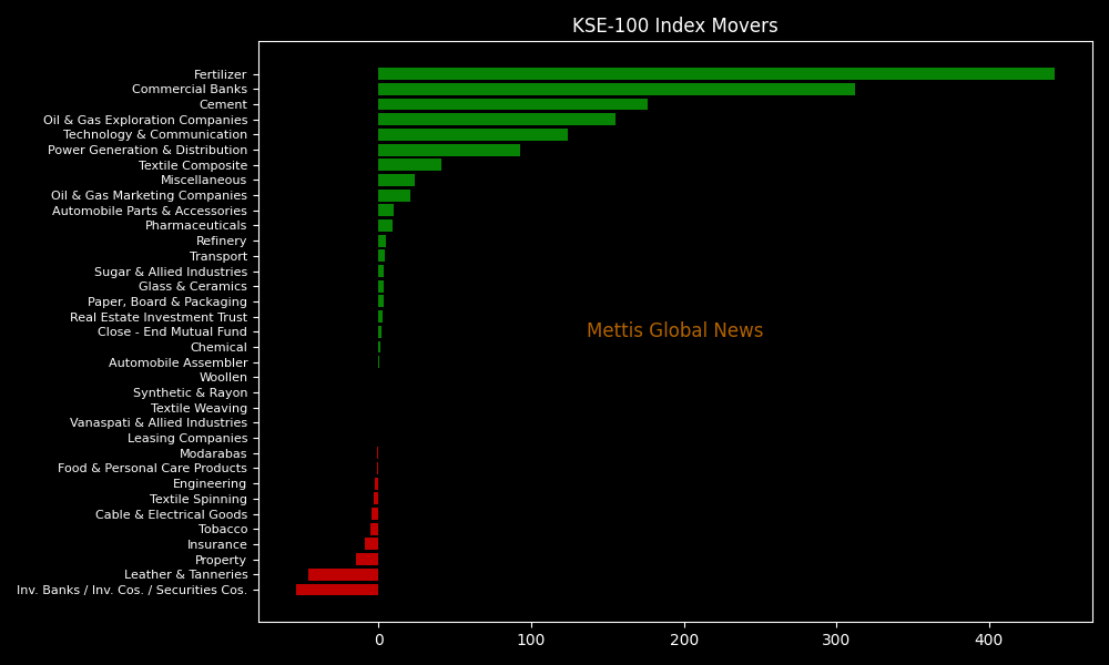 Sector-wise, KSE-100 Index was supported by Fertilizer (+442.80pts), Commercial Banks (+312.43pts), Cement (+176.23pts), Oil & Gas Exploration Companies (+155.20pts), and Technology & Communication (+123.67pts).
