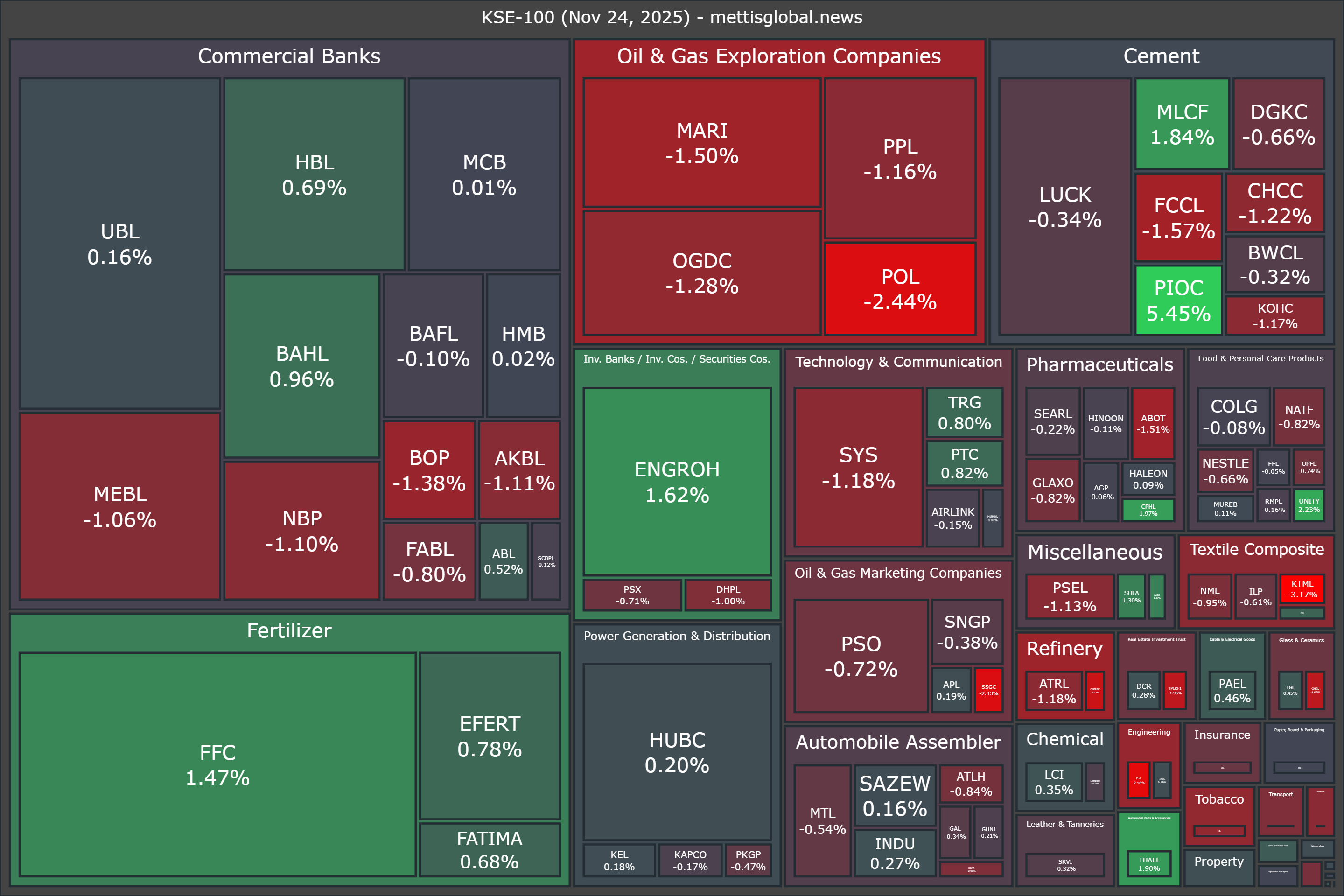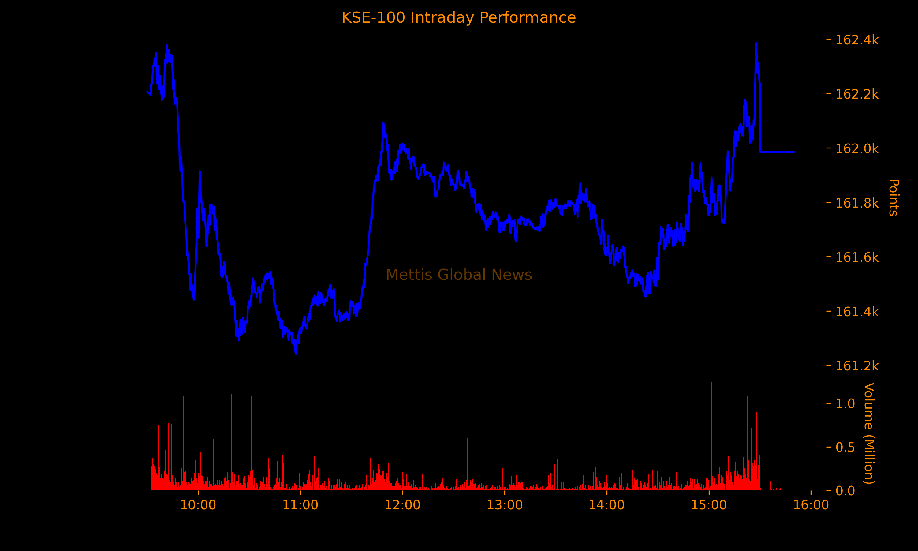 November 24, 2025 (MLN): The benchmark KSE-100 Index concluded Monday's trading session at 161,984.08, showing a decrease of 118.84 points or 0.07%.