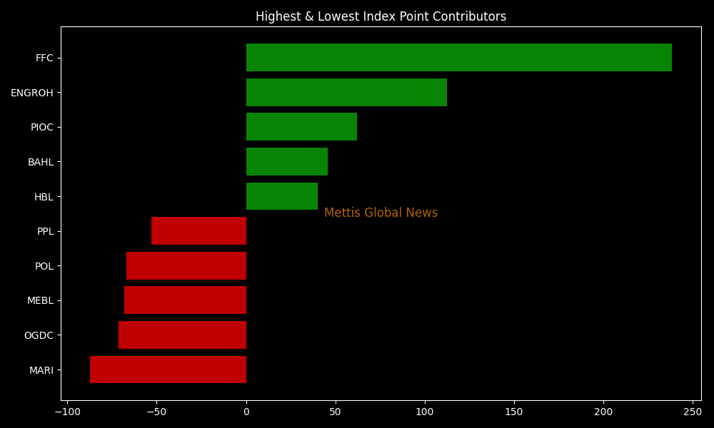 In terms of index-point contributions, companies that dragged the index lower were MARI (-87.27pts), OGDC (-71.42pts), MEBL (-68.07pts), POL (-66.88pts), and PPL (-53.12pts).