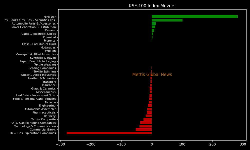 Sector-wise, KSE-100 Index was let down by Oil & Gas Exploration Companies (-278.69pts), Commercial Banks (-52.22pts), Technology & Communication (-39.76pts), Oil & Gas Marketing Companies (-37.64pts), and Textile Composite (-26.99pts).