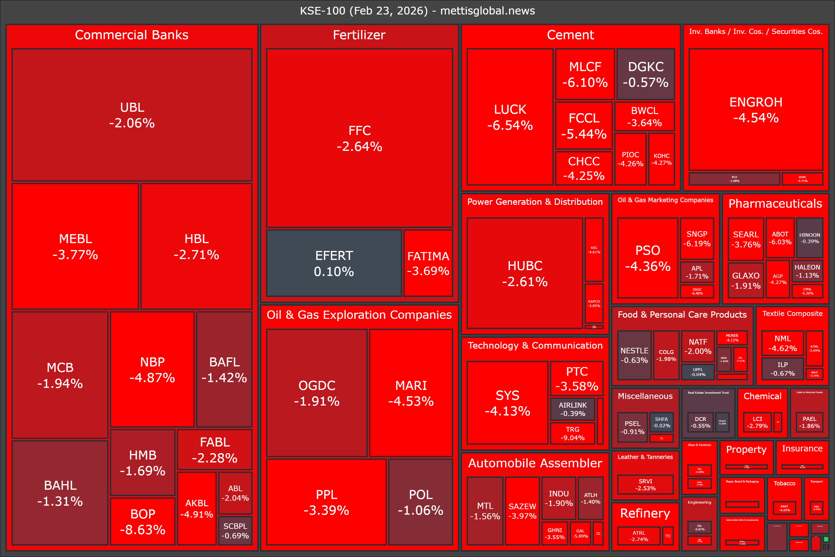 February 23, 2026 (MLN): The KSE-100 Index witnessed a sharp sell-off on Monday, as escalating geopolitical tensions rattled investor confidence and triggered widespread risk aversion across global markets.