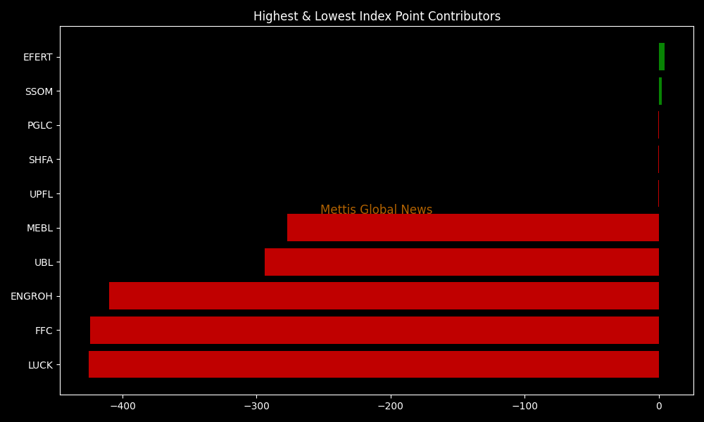 In terms of index-point contributions, major drags on the index were LUCK (-425.05pts), FFC (-424.33pts), ENGROH (-409.85pts), UBL (-293.85pts), and MEBL (-277.26pts).
