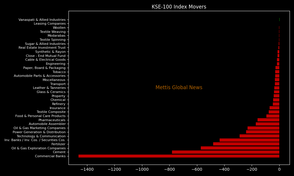 On the upside, limited support came from Vanaspati & Allied Industries (+2.42pts), while Leasing Companies (-0.10pts), Woollen (-0.54pts), Textile Weaving (-0.55pts), and Modarabas (-1.60pts) showed marginal movements.