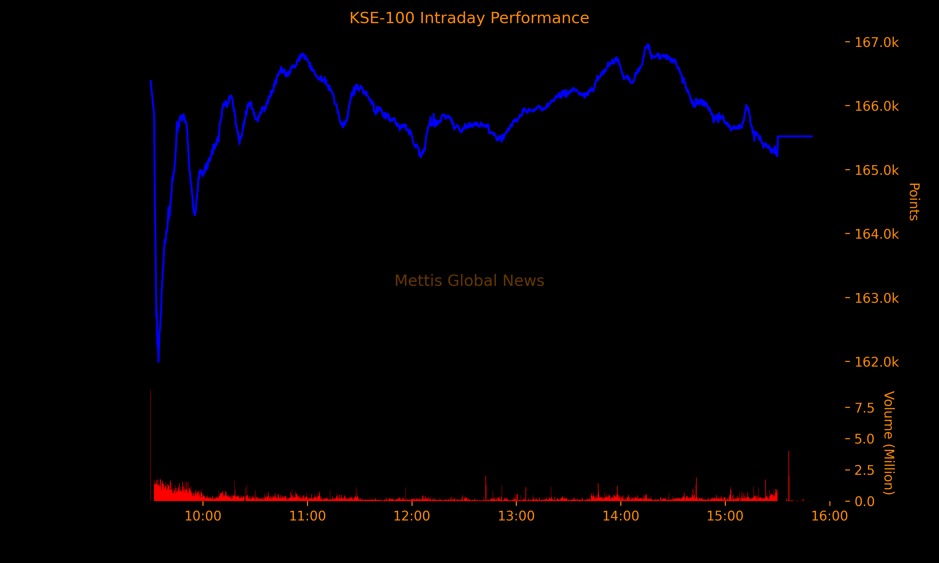 The KSE-100 Index settled at 165,517.51, down 293.49 points or 0.18%. The index witnessed wide swings during the day, trading in a range of 4,969.16 points, with an intraday high of 166,962.16 (+1,151.16 points) and a low of 161,993.00 (-3,818 points).