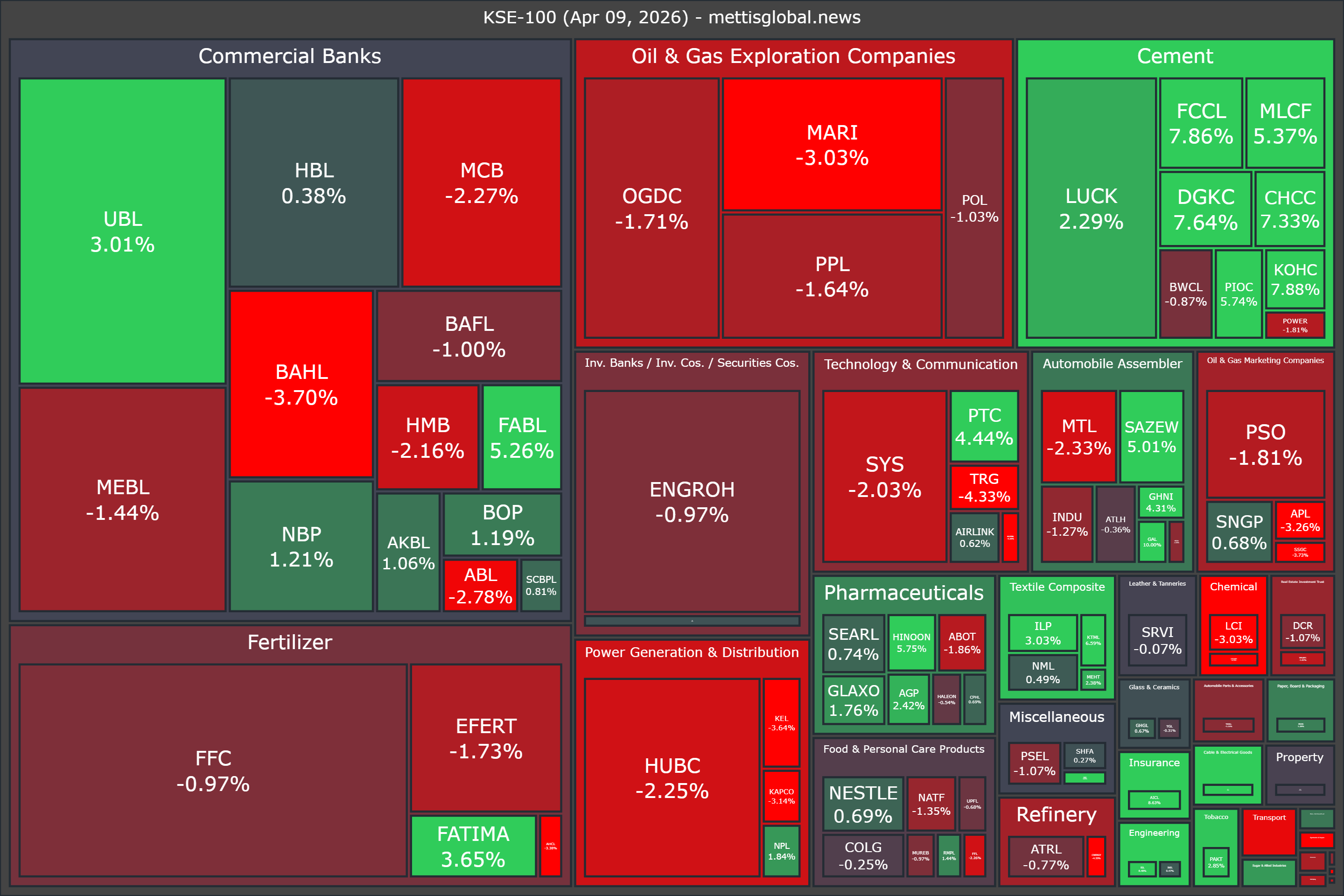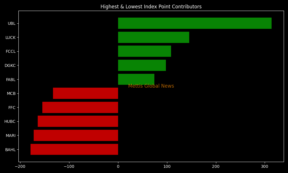 In terms of index-point contribution, the decline was driven by BAHL (-178.66 points), MARI (-172.52 points), HUBC (-164.21 points), FFC (-154.69 points), and MCB (-132.89 points). Meanwhile, support came from UBL (+313.96 points), LUCK (+145.65 points), FCCL (+108.60 points), DGKC (+97.97 points), and FABL (+74.03 points).