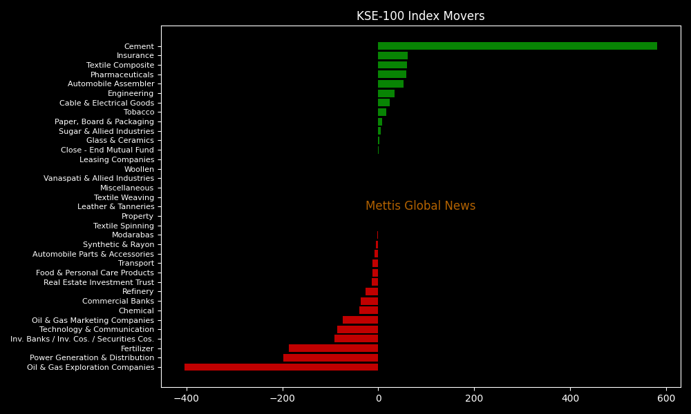 Sector-wise, the KSE-100 Index was weighed down by Oil & Gas Exploration Companies (-403.80 points), Power Generation & Distribution (-198.02 points), Fertilizer (-186.87 points), Investment Banks/Companies/Securities Companies (-91.08 points), and Technology & Communication (-85.72 points). On the upside, strong support came from Cement (+581.19 points), along with contributions from insurance, textile, pharmaceutical, and automobile assembler sectors.