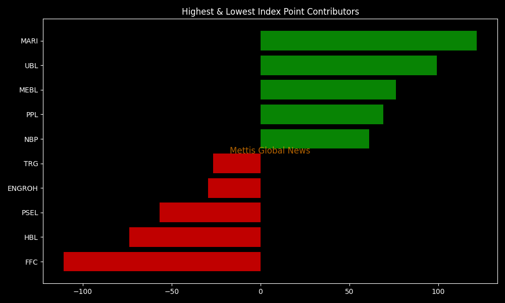 In terms of index-point contributions, companies that propped up the index were MARI (+121.59pts), UBL (+99.25pts), MEBL (+76.08pts), PPL (+68.96pts), and NBP (+61.02pts).