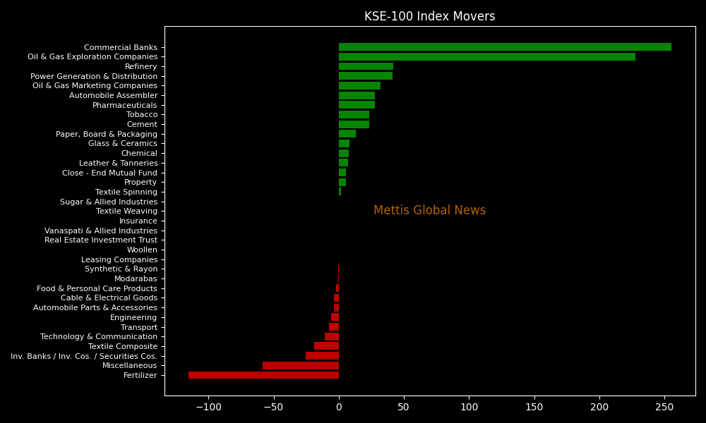 Sector-wise, KSE-100 Index was supported by Commercial Banks (+255.09pts), Oil & Gas Exploration Companies (+227.65pts), Refinery (+41.54pts), Power Generation & Distribution (+41.20pts), and Oil & Gas Marketing Companies (+32.11pts).