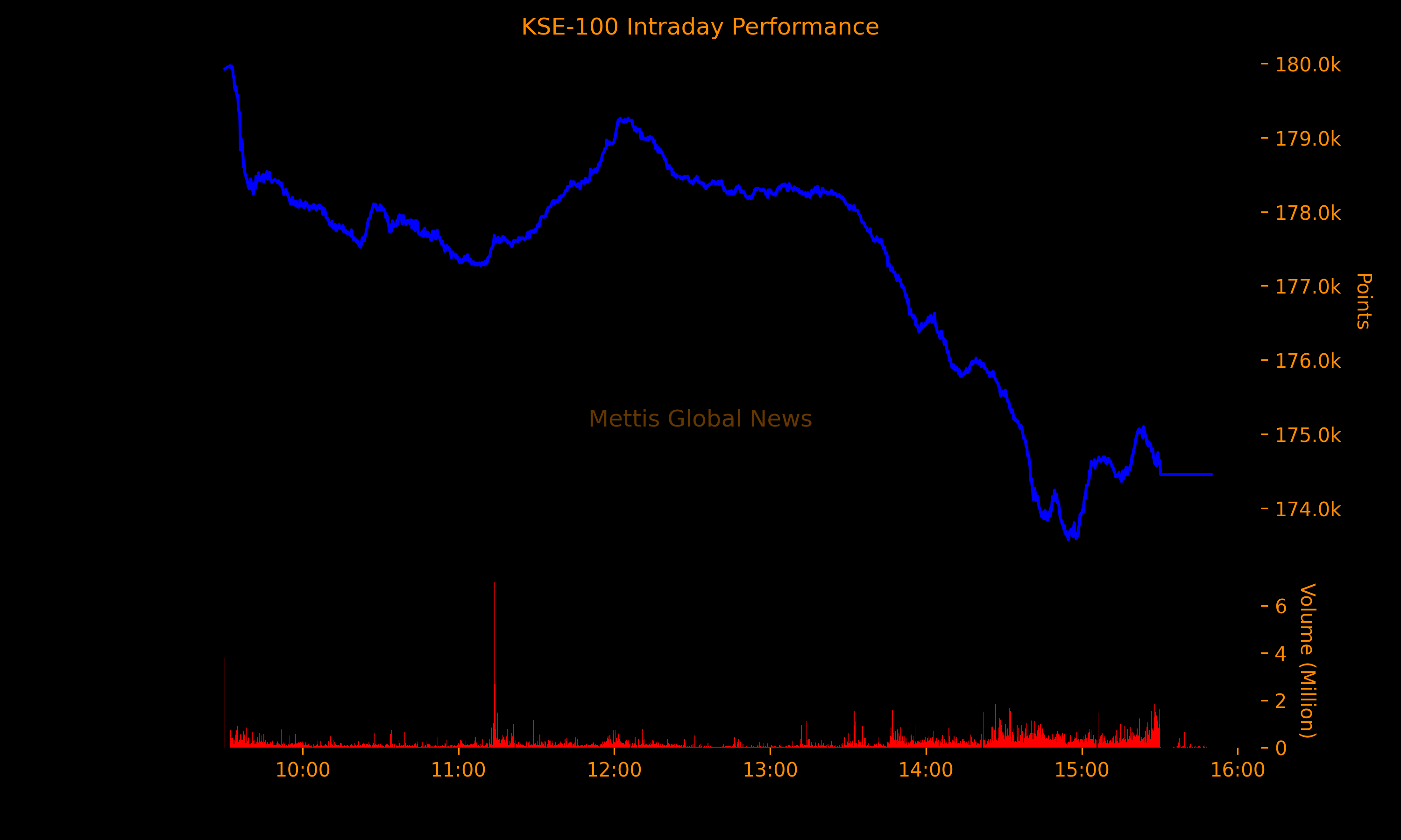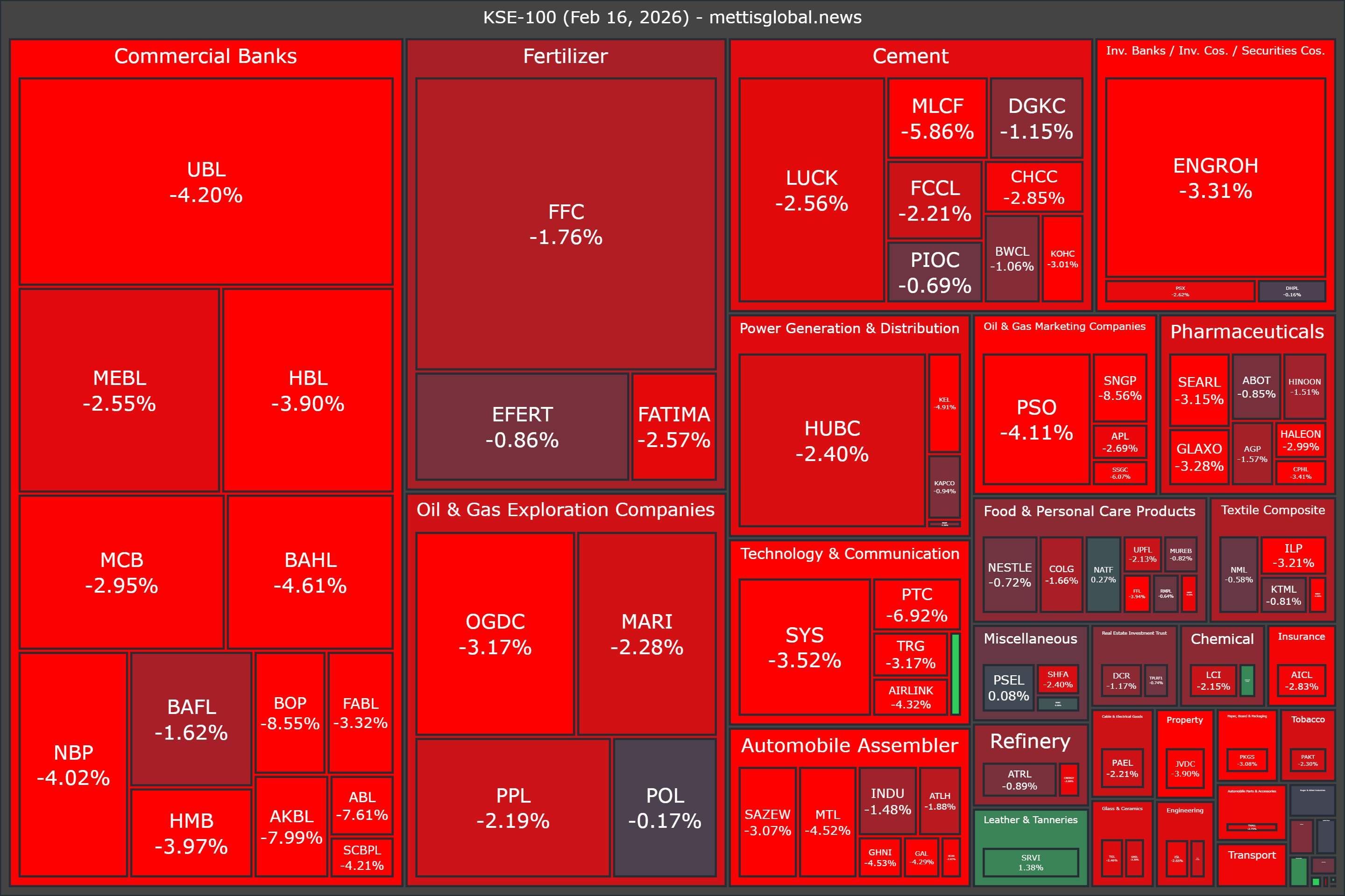 February 16, 2026 (MLN): The benchmark KSE-100 Index concluded Monday's trading session at 174,453.93, showing a decrease of 5,149.80 points or 2.87%.