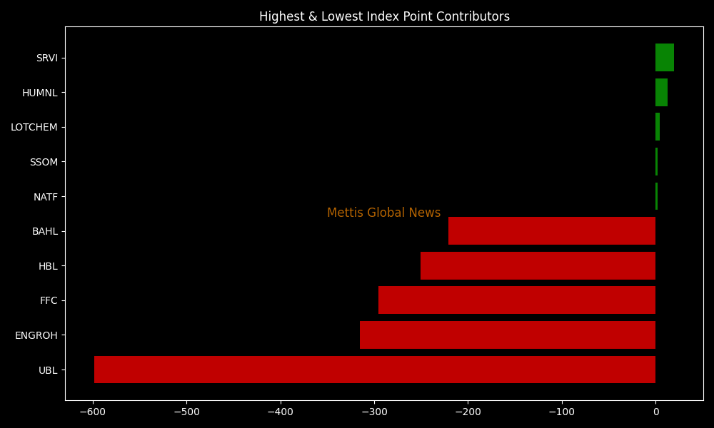 In terms of index-point contributions, companies that dragged the index lower were UBL (-598.33pts), ENGROH (-315.44pts), FFC (-295.21pts), HBL (-250.39pts), and BAHL (-220.72pts).