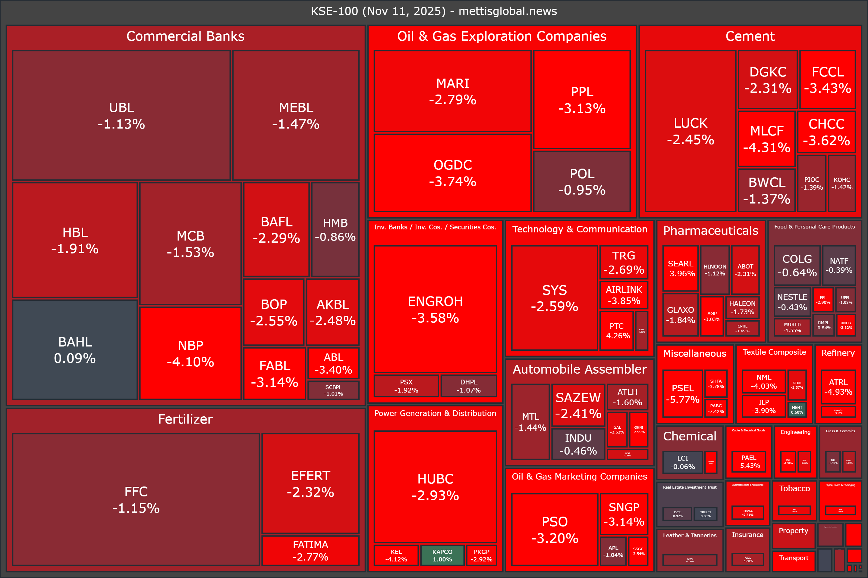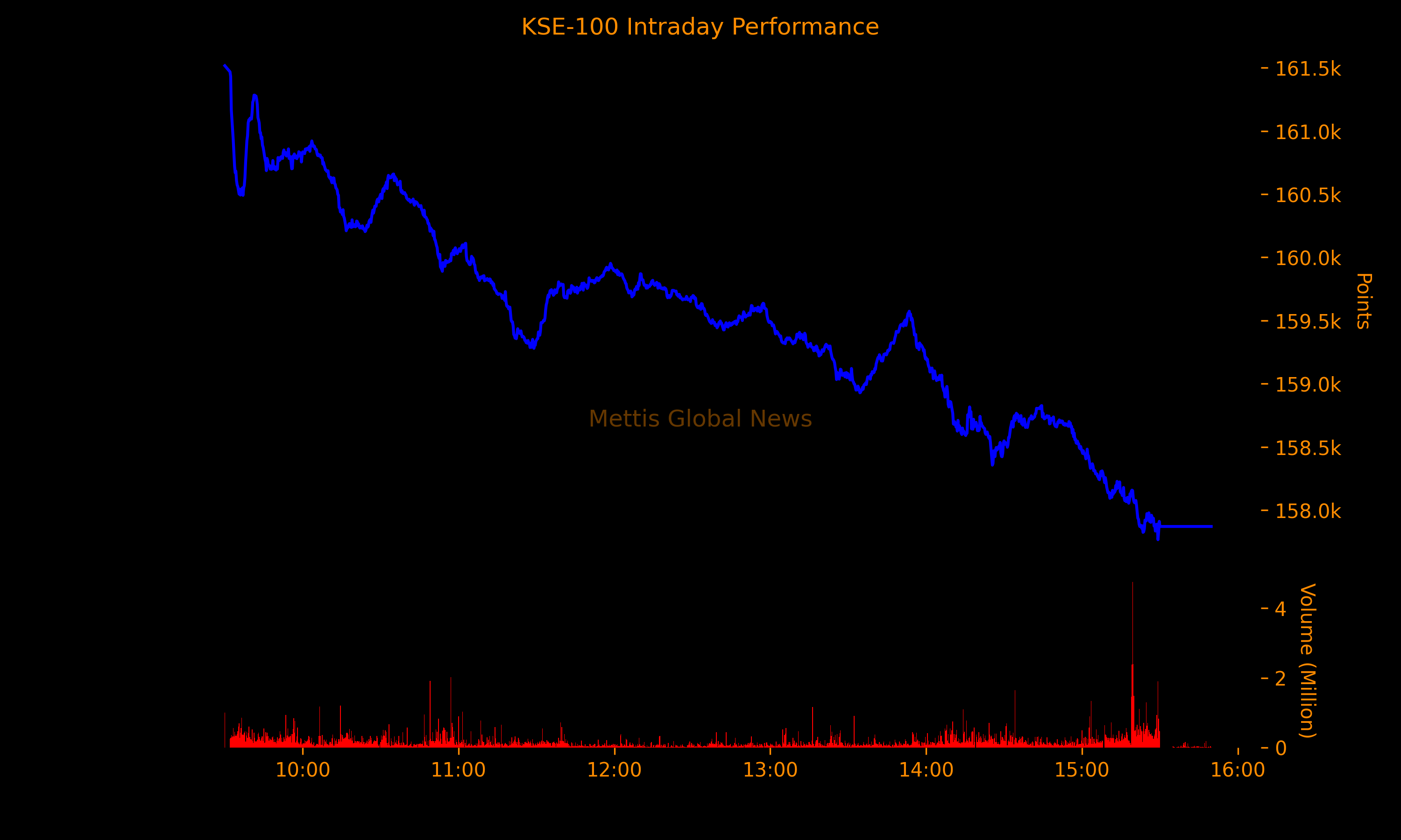 November 11, 2025 (MLN): The benchmark KSE-100 Index concluded Tuesday's trading session at 157,870.50, showing a decrease of 3,667.90 points or 2.27%.