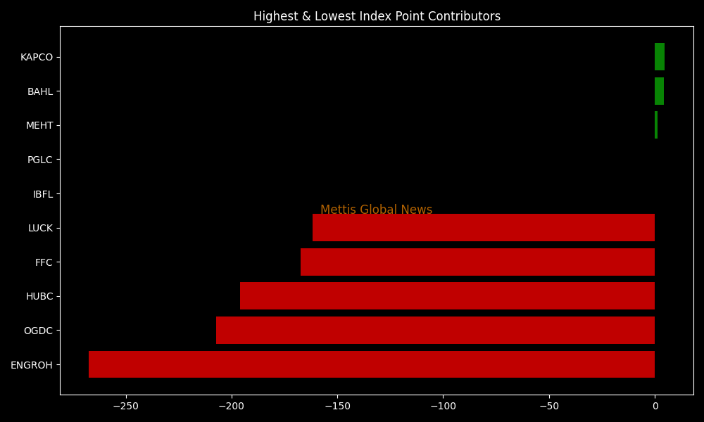 In terms of index-point contributions, companies that dragged the index lower were ENGROH (-267.36pts), OGDC (-207.38pts), HUBC (-196.03pts), FFC (-167.19pts), and LUCK (-161.63pts).