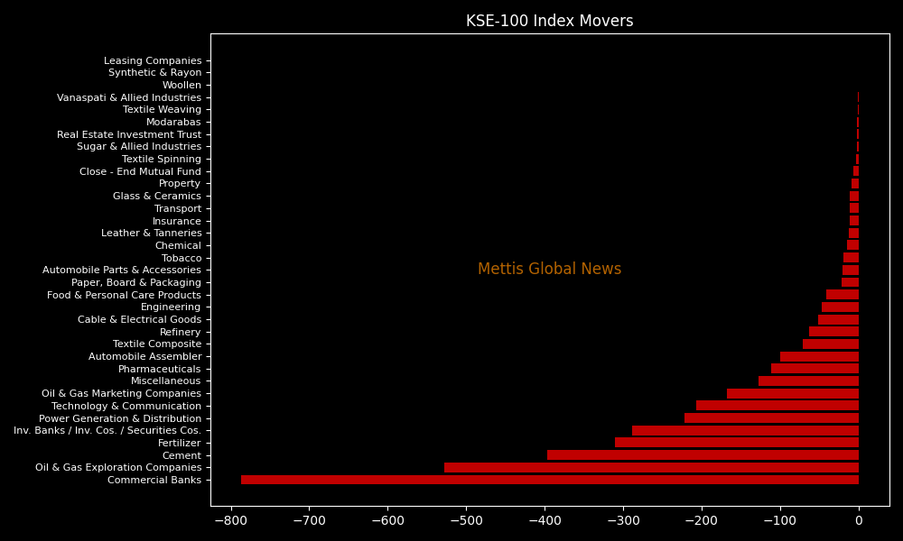 Sector-wise, KSE-100 Index was let down by Commercial Banks (-786.61pts), Oil & Gas Exploration Companies (-528.45pts), Cement (-396.50pts), Fertilizer (-310.28pts), and Inv. Banks / Inv. Cos. / Securities Cos. (-288.21pts).