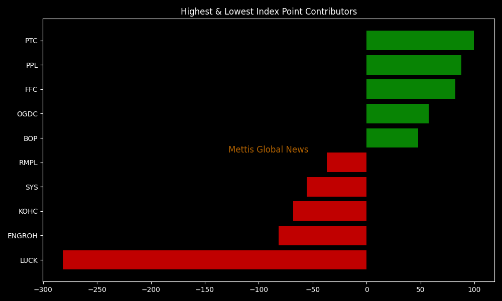 In terms of index-point contributions, companies that dragged the index lower were LUCK (-281.12pts), ENGROH (-81.37pts), KOHC (-67.95pts), SYS (-55.55pts), and RMPL (-36.76pts).