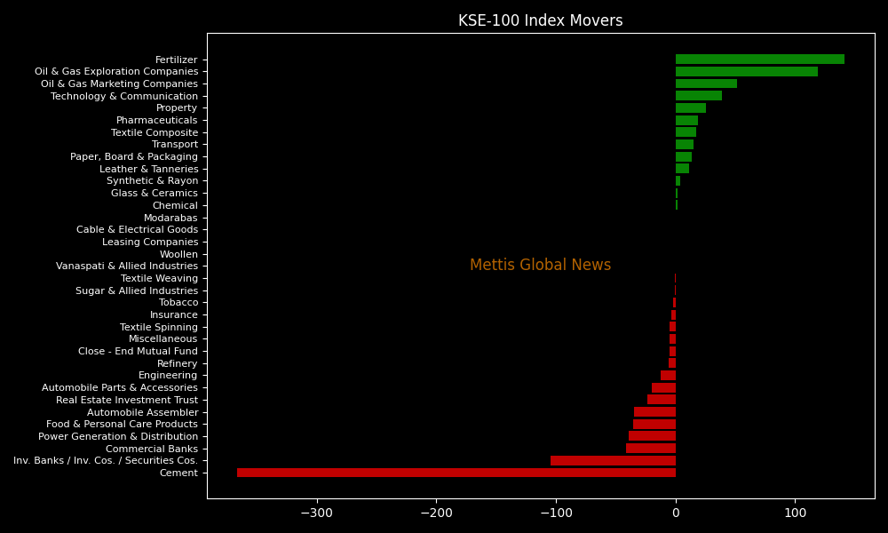 While the index was supported by Fertilizer (+141.29pts), Oil & Gas Exploration Companies (+119.43pts), Oil & Gas Marketing Companies (+51.54pts), Technology & Communication (+38.86pts), and Property (+25.80pts).