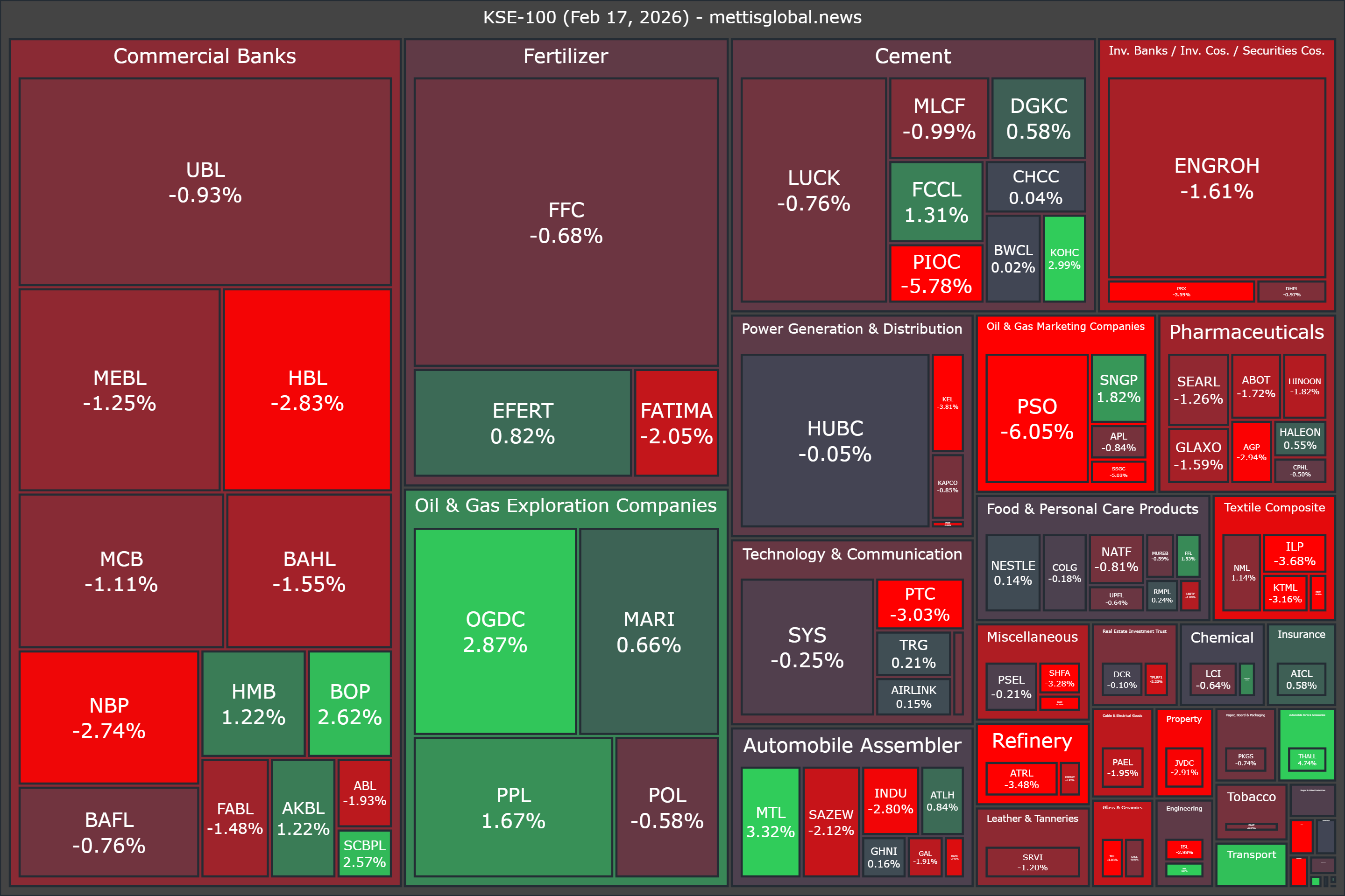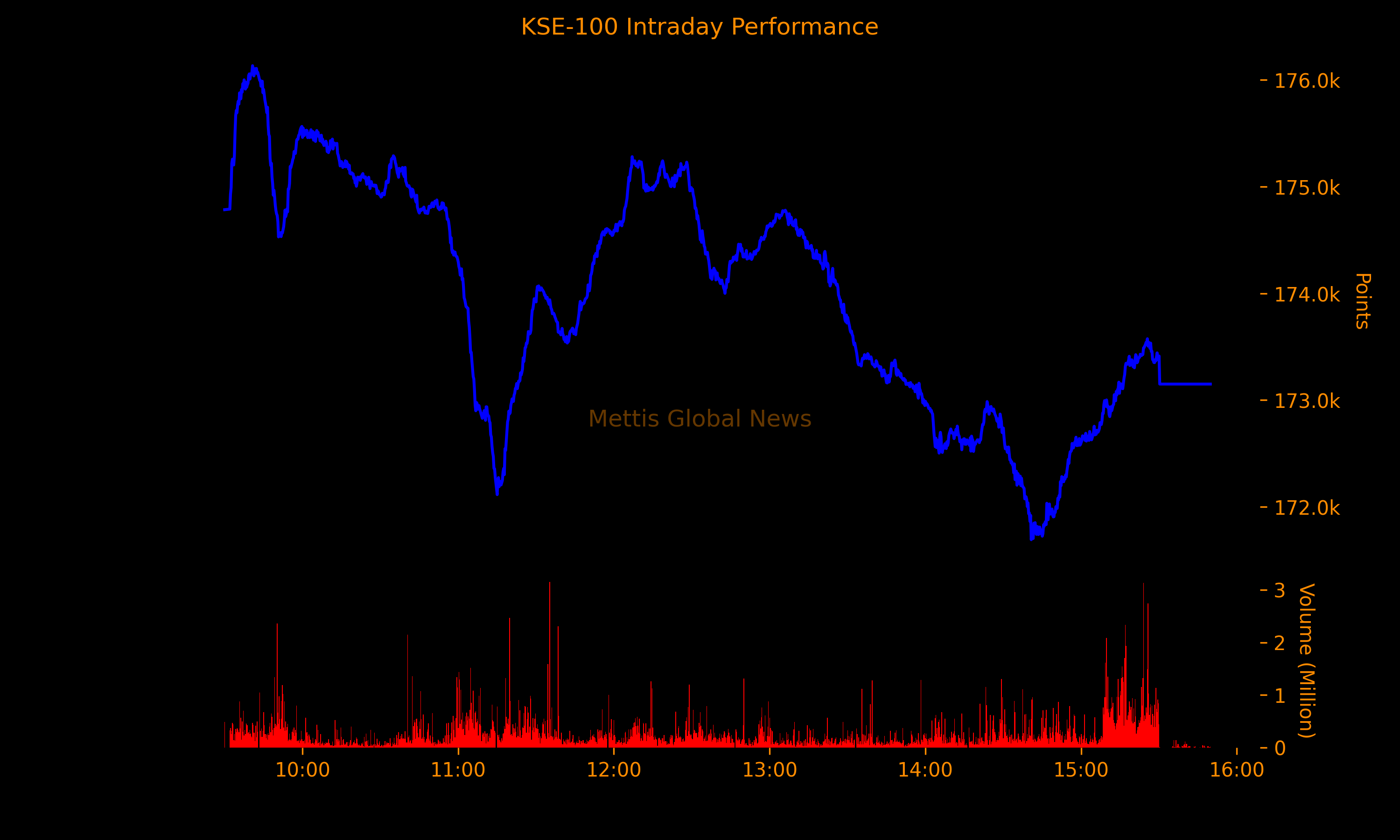 February 17, 2026 (MLN): The benchmark KSE-100 Index concluded Tuesday's trading session at 173,150.41, showing a decrease of 1,303.52 points or 0.75%.