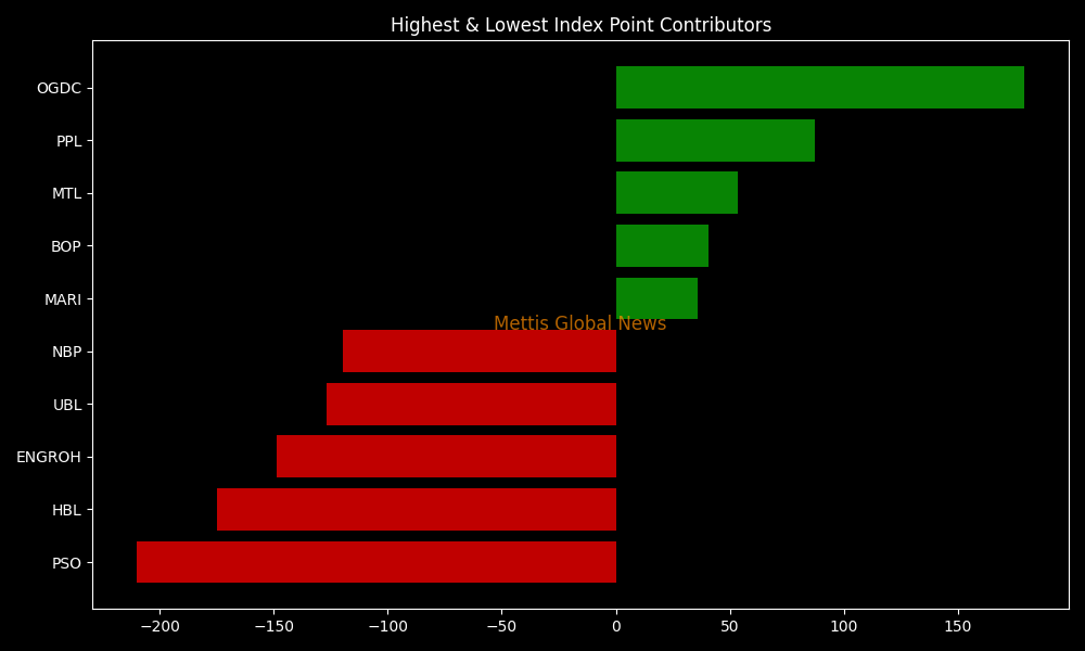 In terms of index-point contributions, companies that dragged the index lower were PSO (-209.89pts), HBL (-174.81pts), ENGROH (-148.90pts), UBL (-126.86pts), and NBP (-119.77pts).