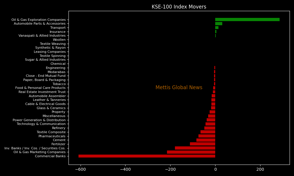 While the index was supported by Oil & Gas Exploration Companies (+286.11pts), Automobile Parts & Accessories (+31.44pts), Transport (+14.17pts), Insurance (+5.31pts), and Vanaspati & Allied Industries (+2.46pts).