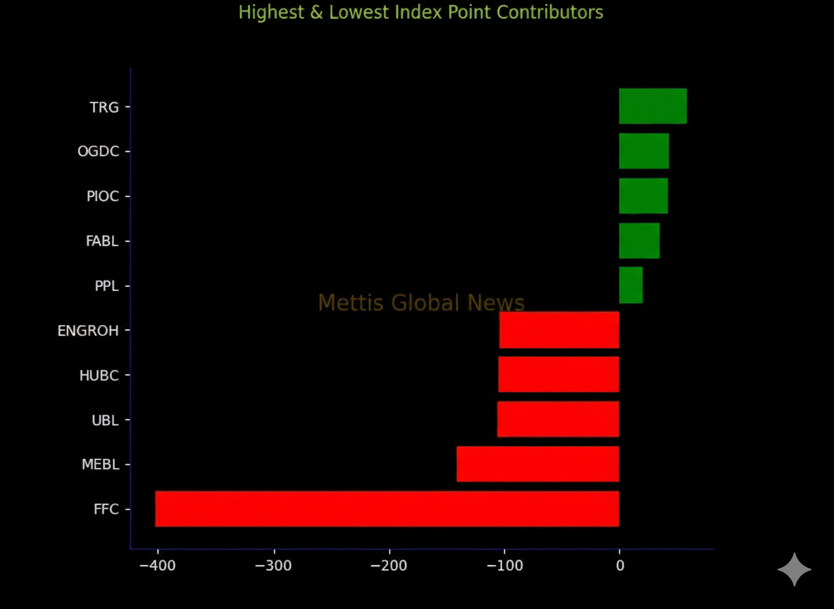 Companies dragging the index lower were FFC with 401.34, MEBL with 141.2, UBL with 105.98, HUBC with 105.15 and ENGROH with 104.02 points.