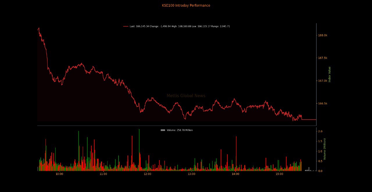 December 03, 2025 (MLN): KSE100 Index closed Wednesday's trading session at 166,145.34 showing a decrease of 0.89 percent or 1,496.93 points.