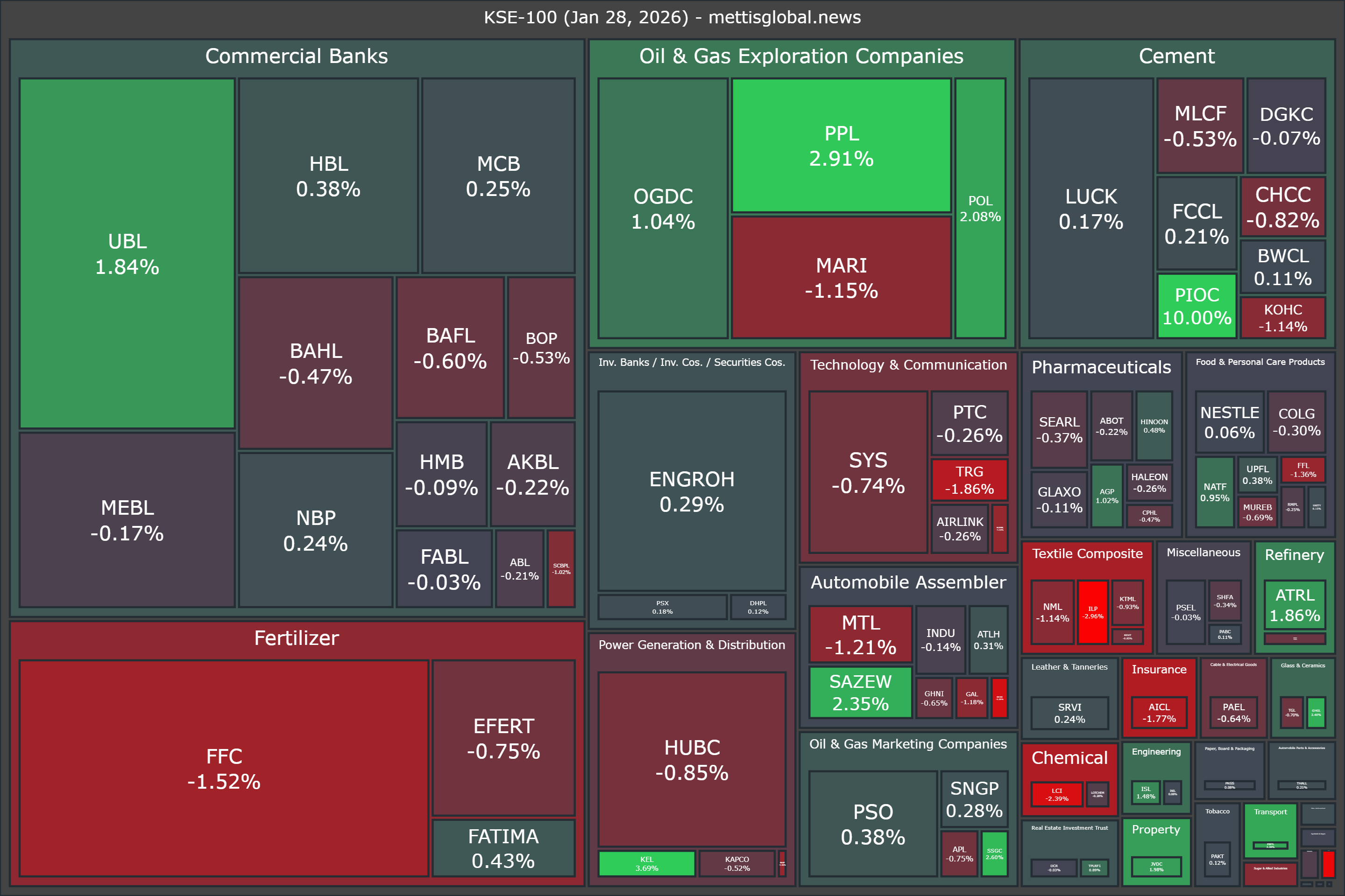 Top gainers during the day were PIOC (+10.00%), KEL (+3.69%), PPL (+2.91%), SSGC (+2.60%), and GHGL (+2.40%).