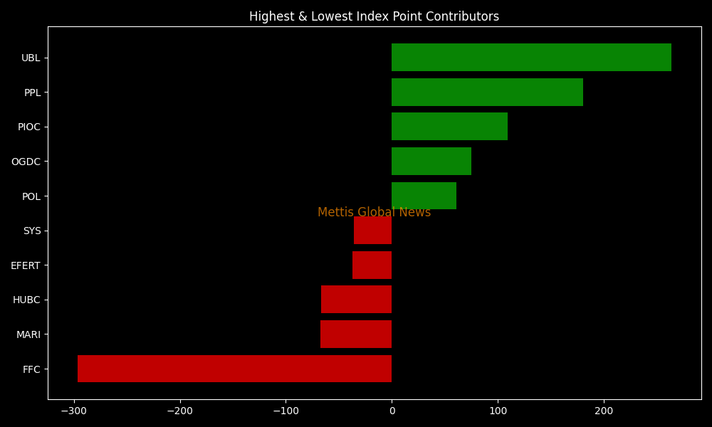 In terms of index-point contributions, companies that propped up the index were UBL (+263.80pts), PPL (+180.39pts), PIOC (+109.46pts), OGDC (+75.14pts), and POL (+60.58pts).