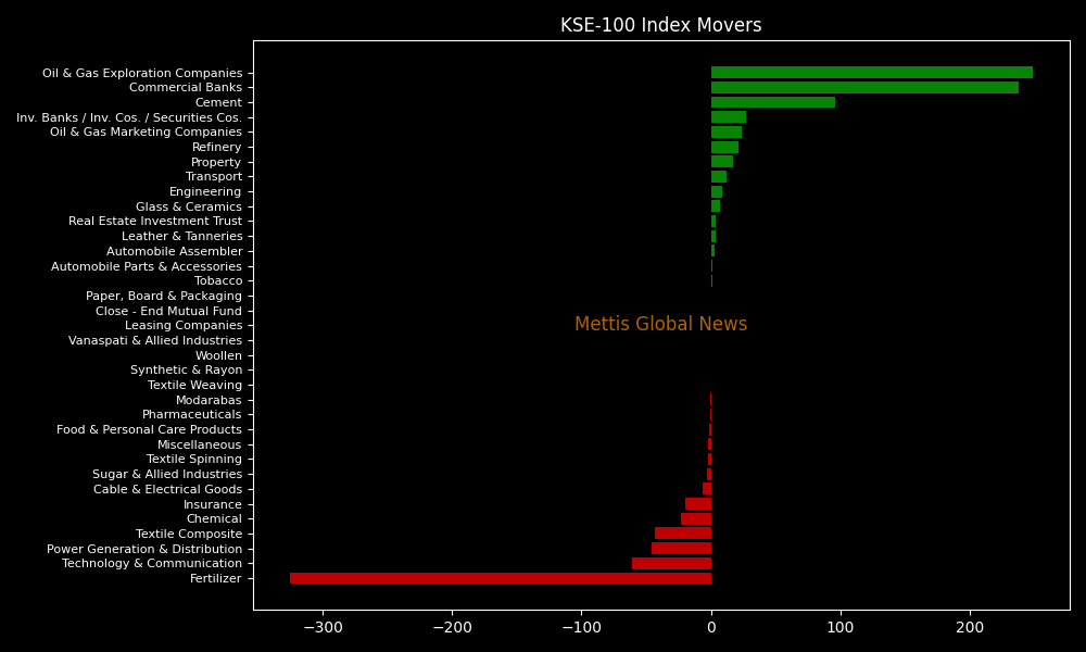 Sector-wise, KSE-100 Index was supported by Oil & Gas Exploration Companies (+248.63pts), Commercial Banks (+237.59pts), Cement (+95.81pts), Inv. Banks / Inv. Cos. / Securities Cos. (+27.04pts), and Oil & Gas Marketing Companies (+23.67pts).