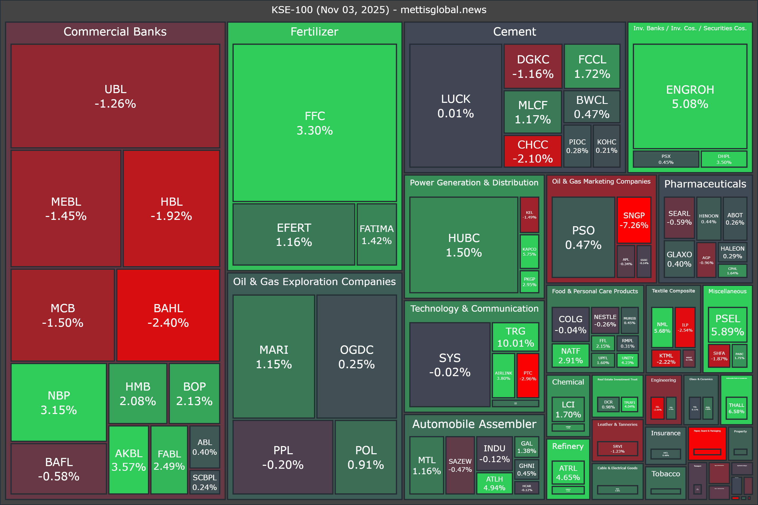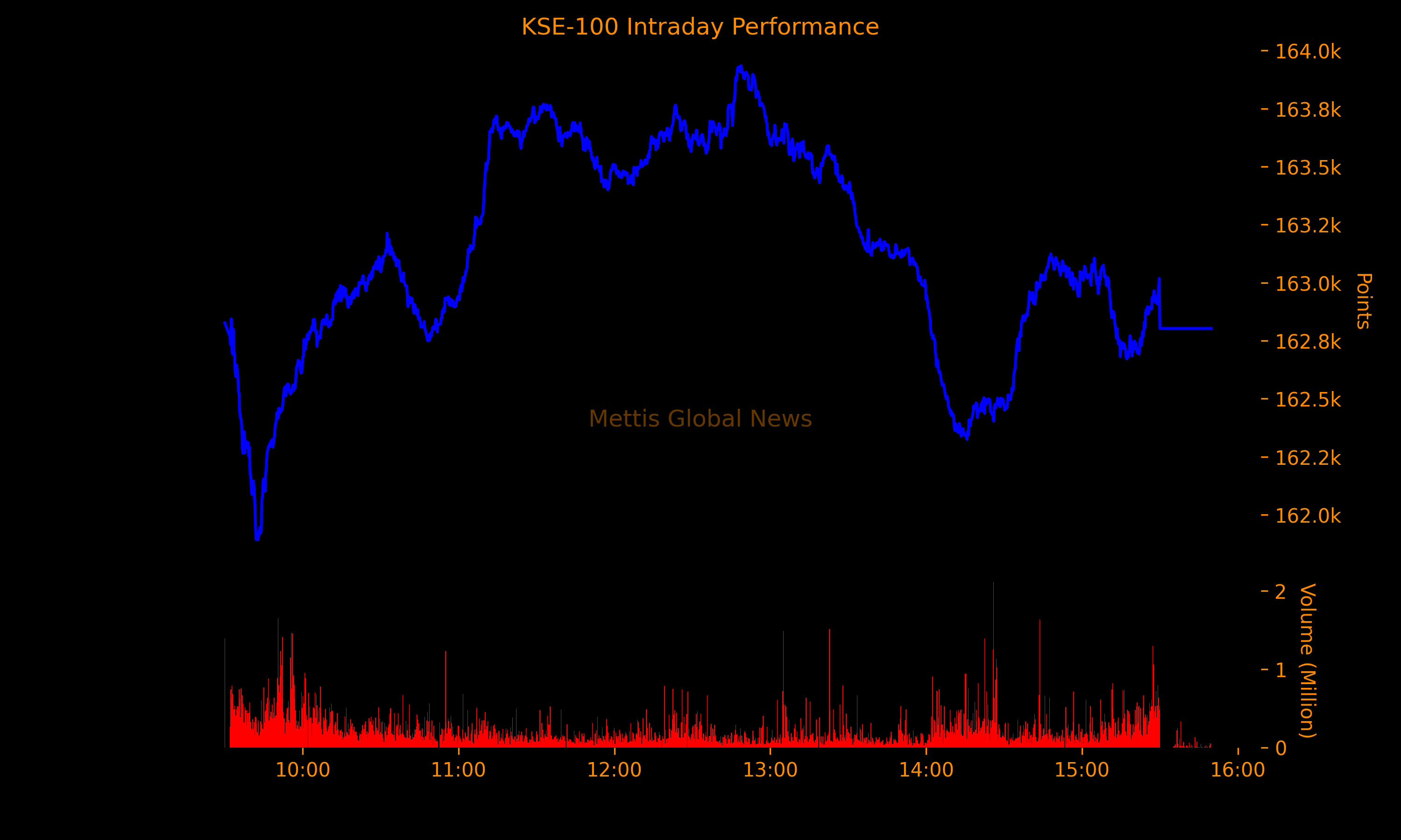 November 03, 2025 (MLN): The benchmark KSE-100 Index concluded Monday's trading session at 162,803.15, showing an increase of 1,171.42 points or 0.72%.