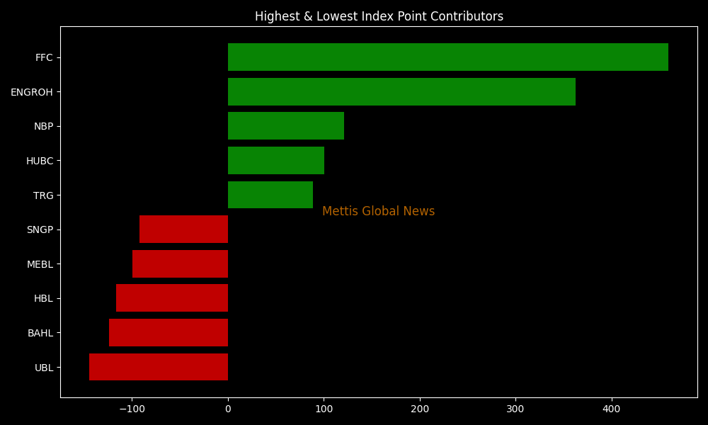 In terms of index-point contributions, companies that propped up the index were FFC (+459.19pts), ENGROH (+362.63pts), NBP (+120.88pts), HUBC (+100.25pts), and TRG (+88.52pts).