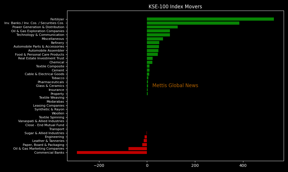 Sector-wise, KSE-100 Index was supported by Fertilizer (+528.30pts), Inv. Banks / Inv. Cos. / Securities Cos. (+384.26pts), Power Generation & Distribution (+127.63pts), Oil & Gas Exploration Companies (+95.36pts), and Technology & Communication (+95.34pts).