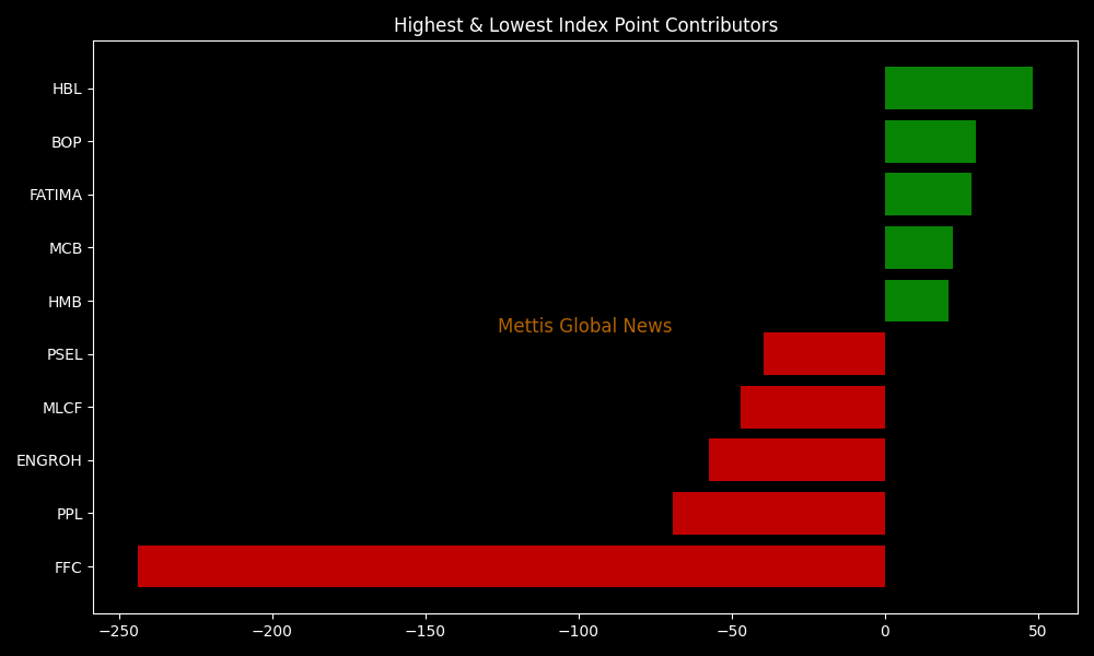 In terms of index-point contributions, companies that dragged the index lower were FFC (-243.71pts), PPL (-69.07pts), ENGROH (-57.42pts), MLCF (-47.20pts), and PSEL (-39.61pts).