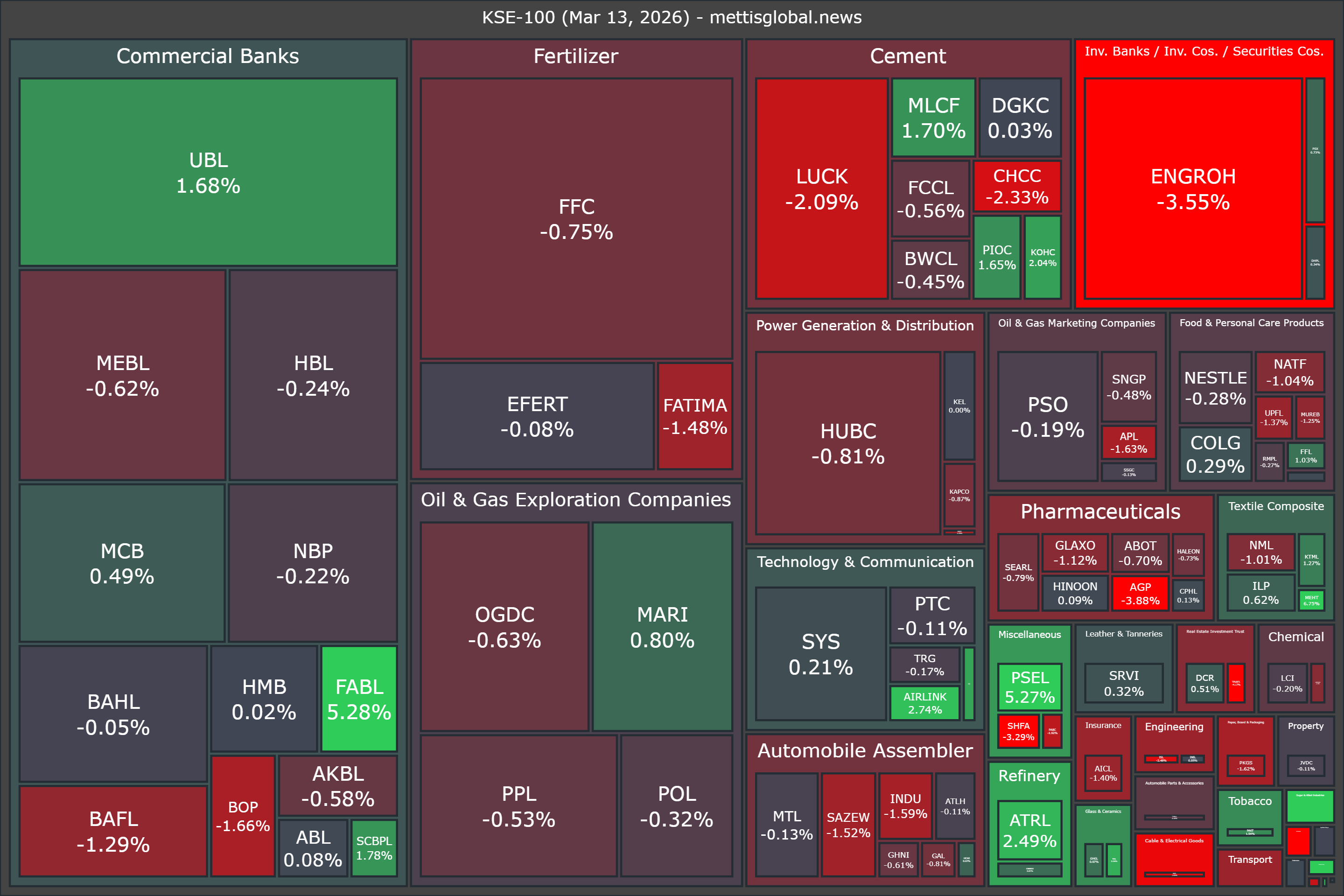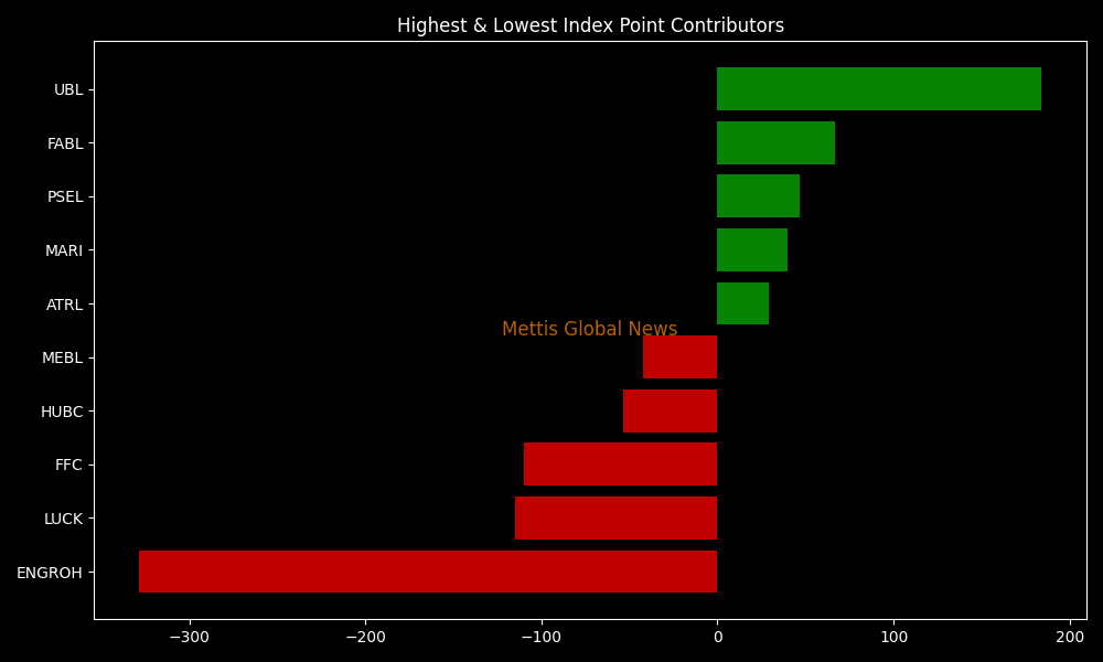 In terms of index-point contributions, ENGROH (-328.31pts), LUCK (-114.69pts), FFC (-109.81pts), HUBC (-53.43pts), and MEBL (-42.38pts) weighed on the index, whereas UBL (+183.88pts), FABL (+66.79pts), PSEL (+46.90pts), MARI (+39.89pts), and ATRL (+29.07pts) provided support.