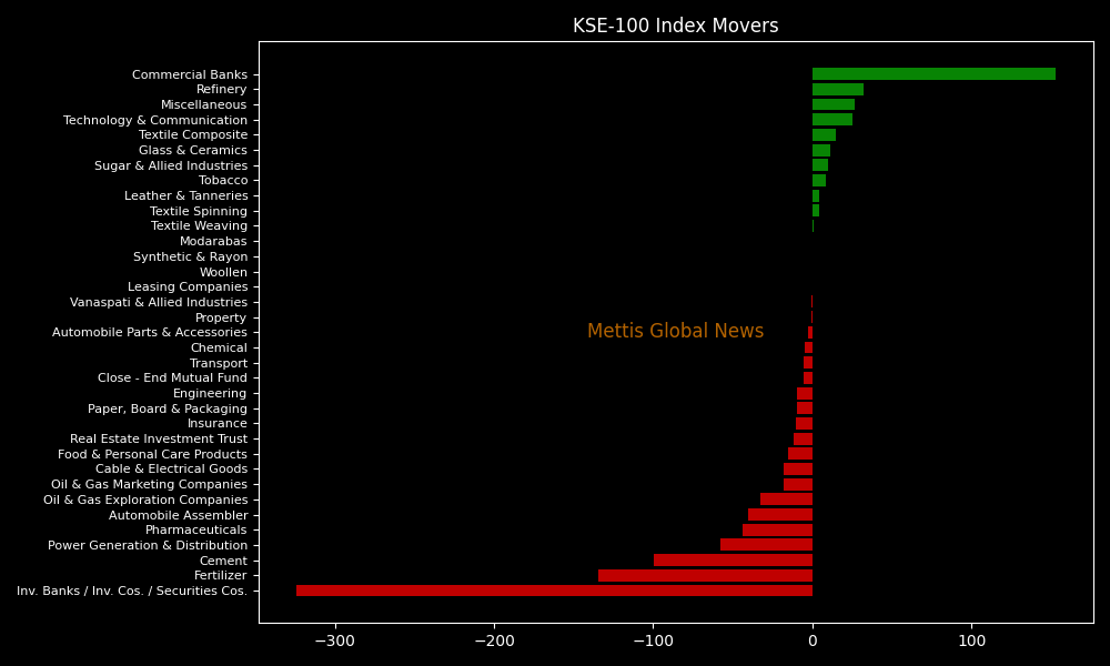 Sector performance saw Investment Banks / Investment Companies / Securities Companies (-324.04pts), Fertilizer (-134.26pts), Cement (-99.53pts), Power Generation & Distribution (-57.97pts), and Pharmaceuticals (-43.52pts) pulling the index down. Support came from Commercial Banks (+152.70pts), Refinery (+31.88pts), Miscellaneous (+26.84pts), Technology & Communication (+25.29pts), and Textile Composite (+14.42pts).