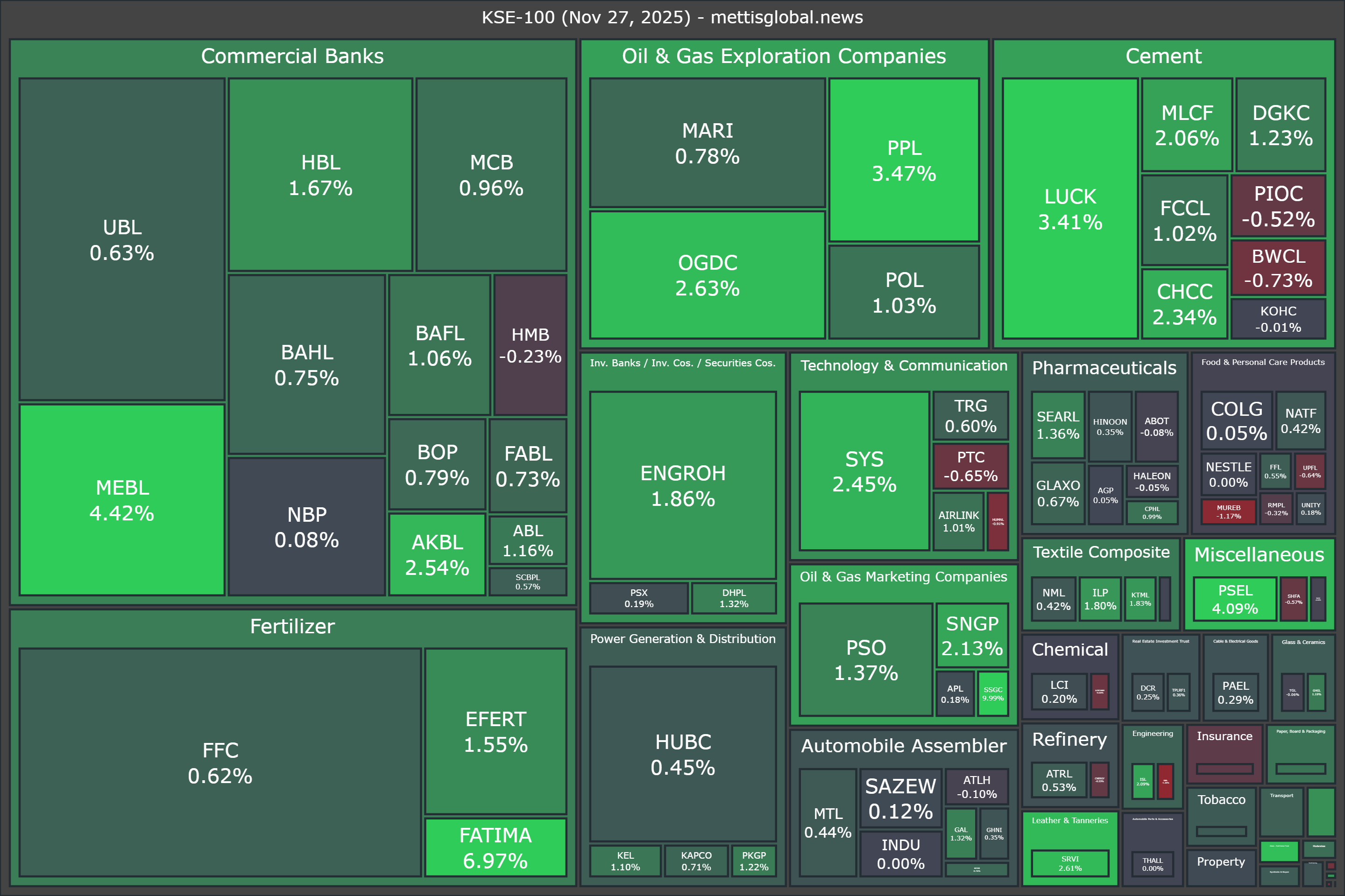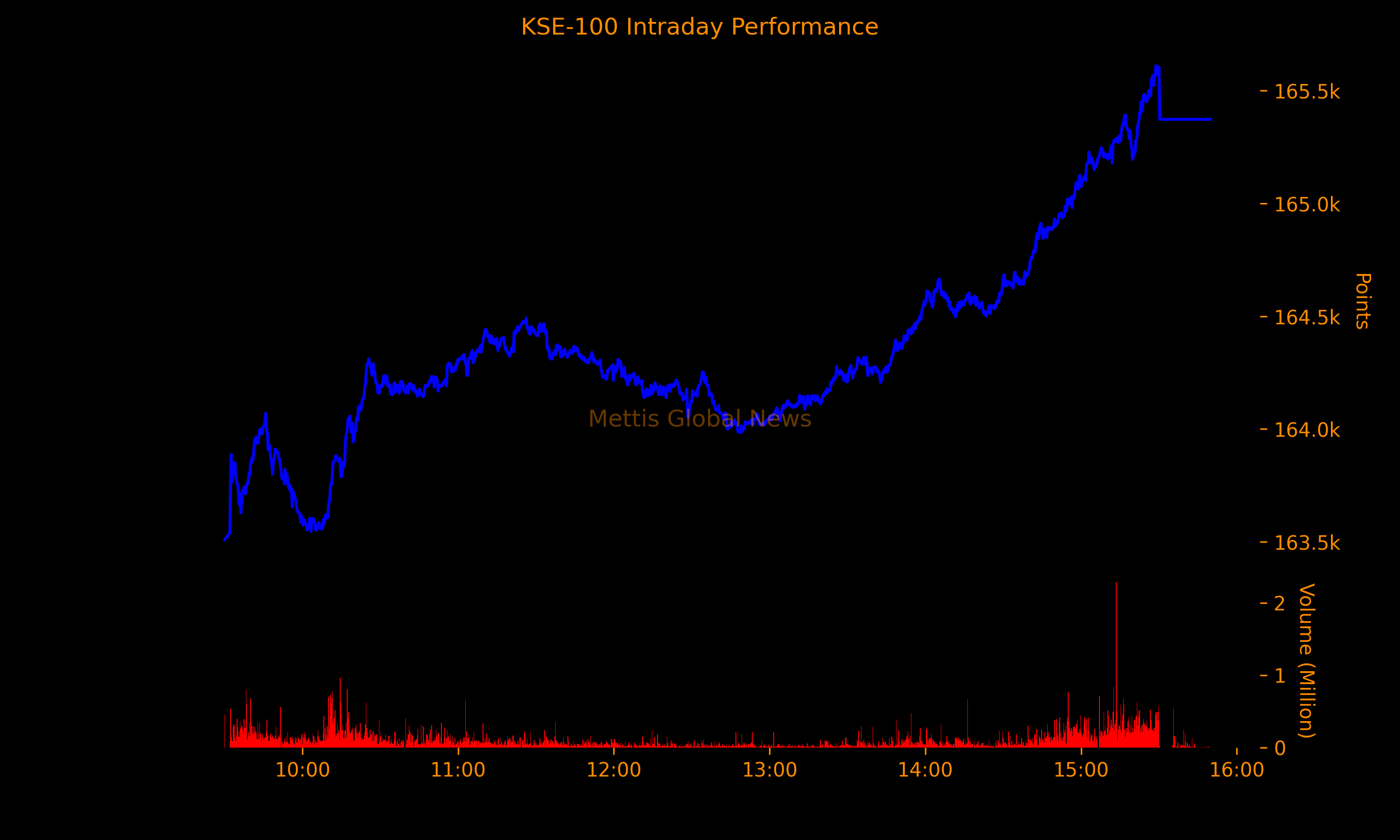 November 27, 2025 (MLN): The benchmark KSE-100 Index concluded Thursday's trading session at 165,373.31, showing an increase of 2,184.78 points or 1.34%.