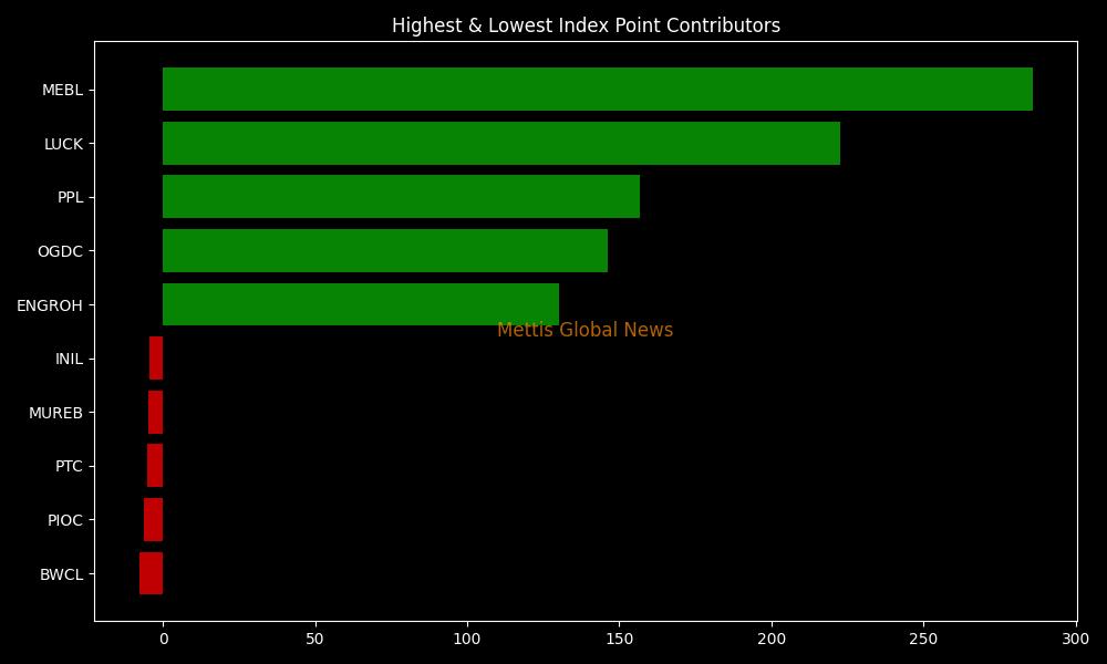 In terms of index-point contributions, companies that propped up the index were MEBL (+285.78pts), LUCK (+222.74pts), PPL (+156.83pts), OGDC (+146.34pts), and ENGROH (+130.27pts).