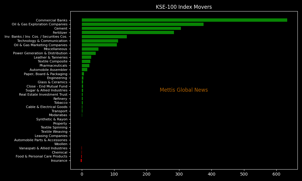 Sector-wise, KSE-100 Index was supported by Commercial Banks (+633.24pts), Oil & Gas Exploration Companies (+375.29pts), Cement (+305.81pts), Fertilizer (+284.12pts), and Inv. Banks / Inv. Cos. / Securities Cos. (+139.38pts).