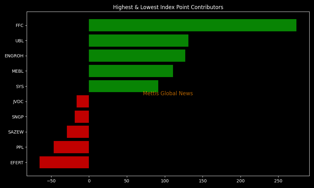 In terms of index-point contributions, companies that propped up the index were FFC (+273.95pts), UBL (+131.25pts), ENGROH (+126.97pts), MEBL (+111.02pts), and SYS (+91.62pts).