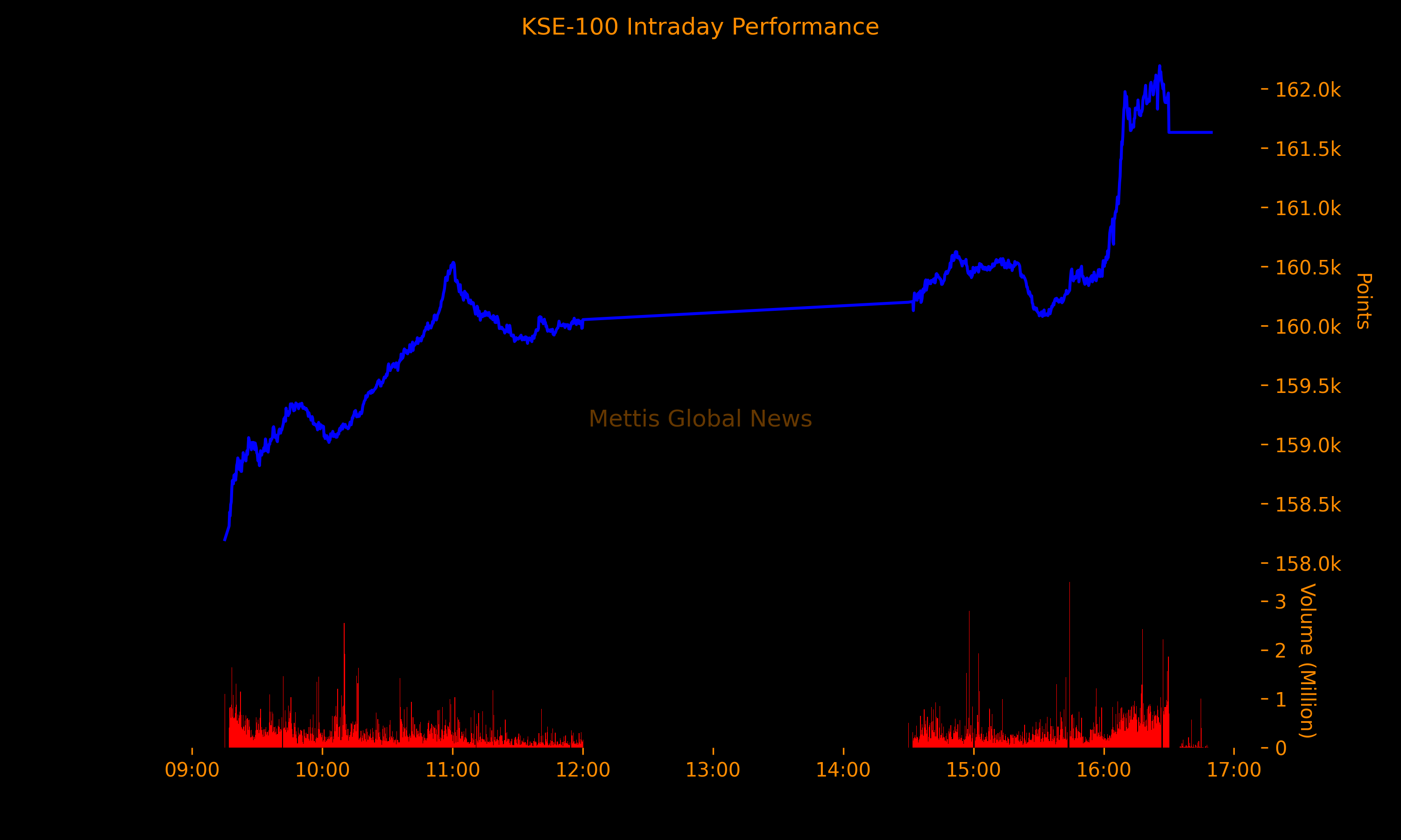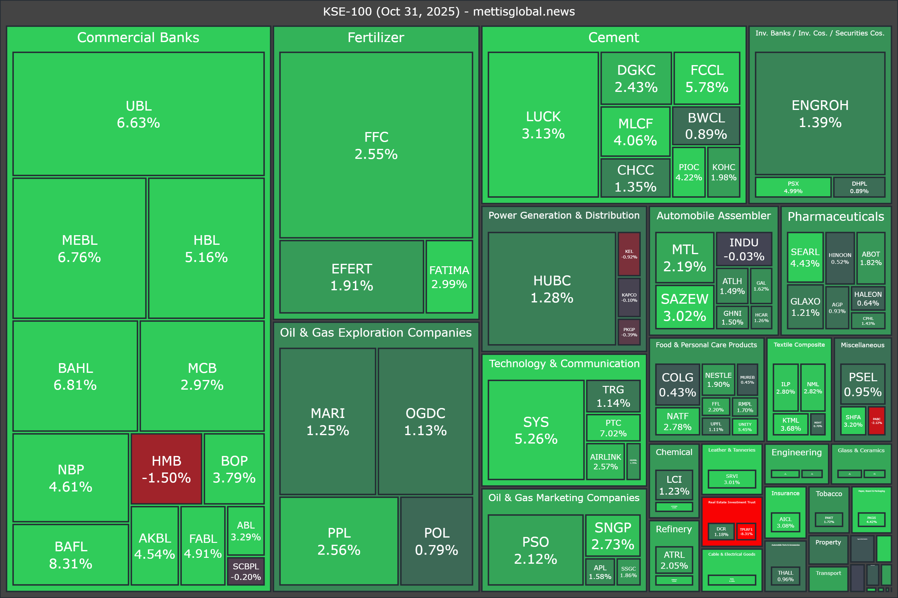 October 31, 2025 (MLN): The benchmark KSE-100 Index concluded Friday's trading session at 161,631.73, showing an increase of 4,898.86 points or 3.13%.