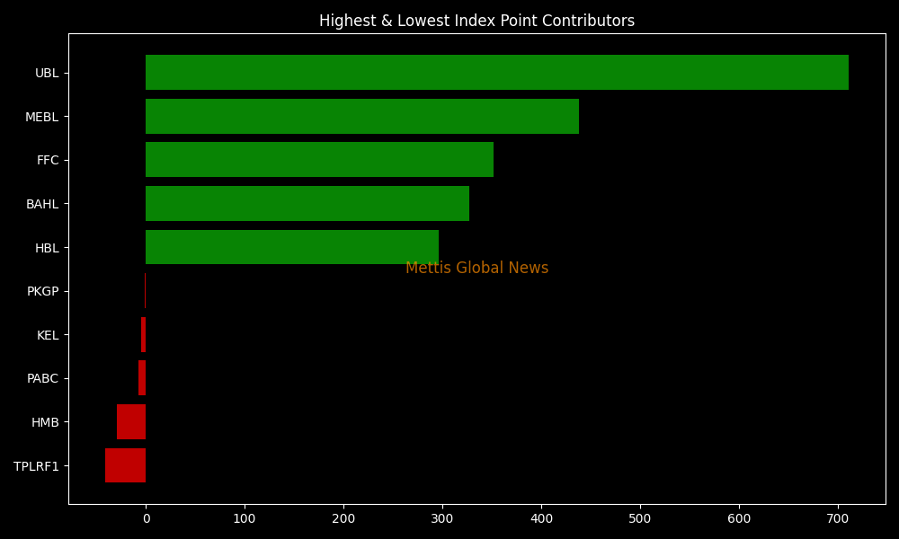 In terms of index-point contributions, companies that propped up the index were UBL (+710.40pts), MEBL (+438.48pts), FFC (+351.38pts), BAHL (+327.01pts), and HBL (+296.11pts).