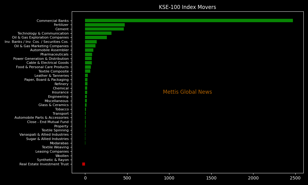 Sector-wise, KSE-100 Index was supported by Commercial Banks (+2471.42pts), Fertilizer (+471.43pts), Cement (+461.67pts), Technology & Communication (+311.91pts), and Oil & Gas Exploration Companies (+259.77pts).