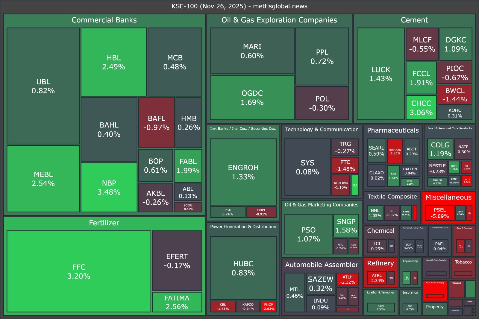 Top gainers during the day were HUMNL (+9.94%), NBP (+3.48%), FFC (+3.20%), CHCC (+3.06%), and FATIMA (+2.56%).