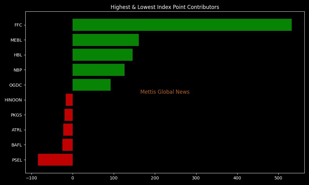 In terms of index-point contributions, companies that propped up the index were FFC (+532.21pts), MEBL (+160.37pts), HBL (+145.88pts), NBP (+126.40pts), and OGDC (+92.73pts).