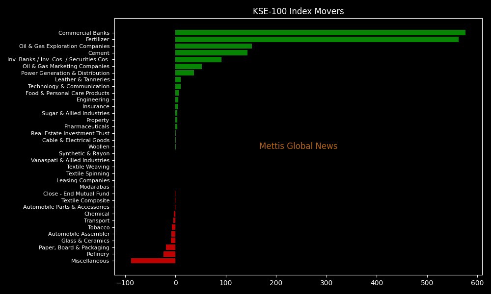 Sector-wise, KSE-100 Index was supported by Commercial Banks (+576.59pts), Fertilizer (+563.05pts), Oil & Gas Exploration Companies (+151.52pts), Cement (+143.50pts), and Inv. Banks / Inv. Cos. / Securities Cos. (+91.24pts).