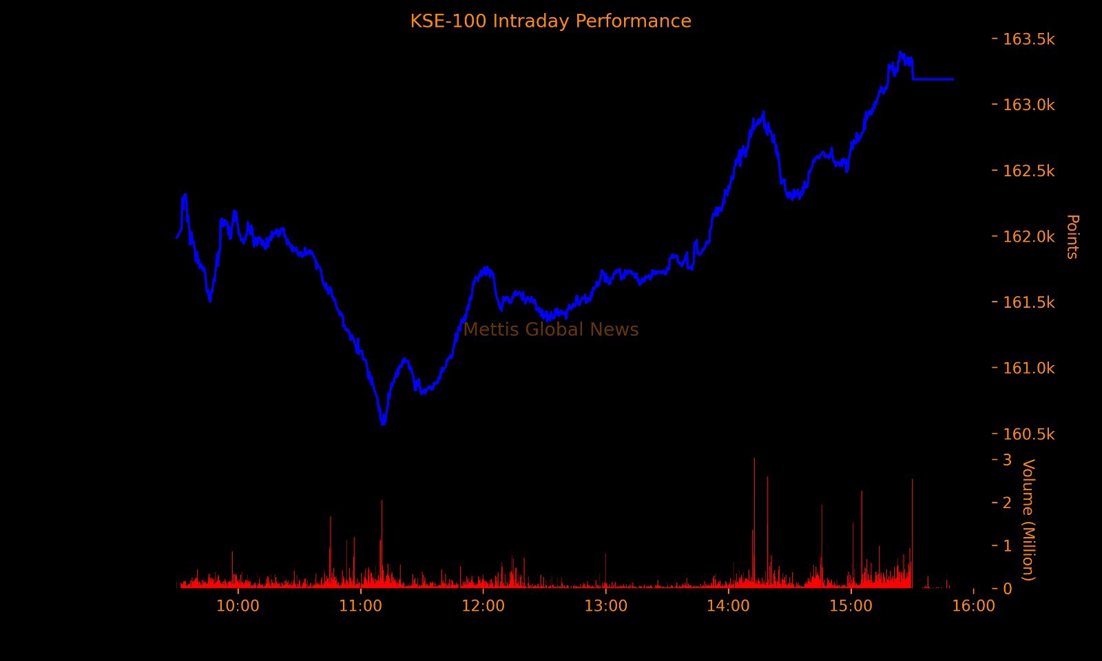 November 26, 2025 (MLN): The benchmark KSE-100 Index concluded Wednesday's trading session at 163,188.53, showing an increase of 1,496.04 points or 0.93%.