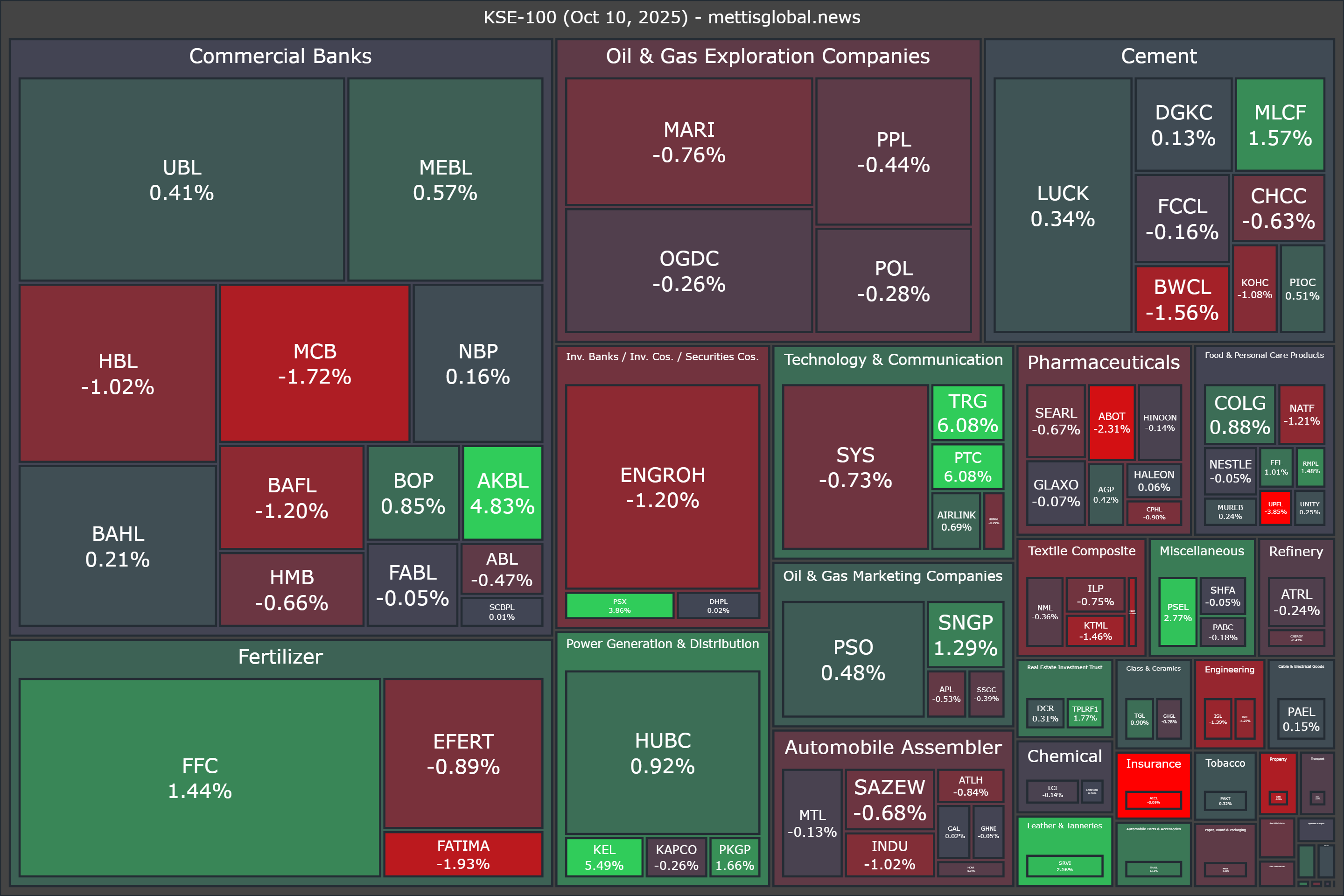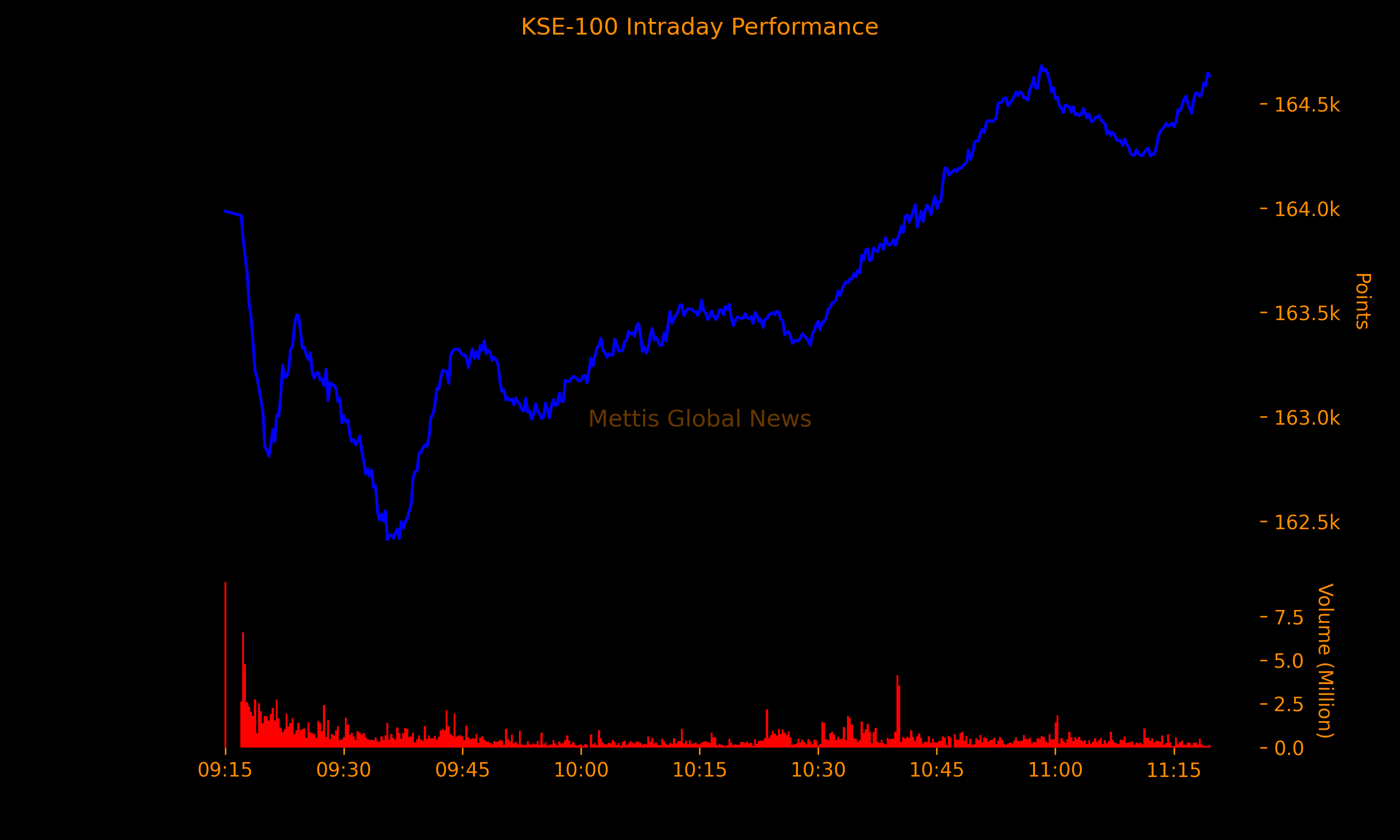 October 10, 2025 (MLN): The benchmark KSE-100 Index holds Friday's intra trading session at 164,611.81, showing an intraday high of 164,681.55 (+69.74) and a low of 162,411.25 (-2,200.56) points as of 11:26 am.