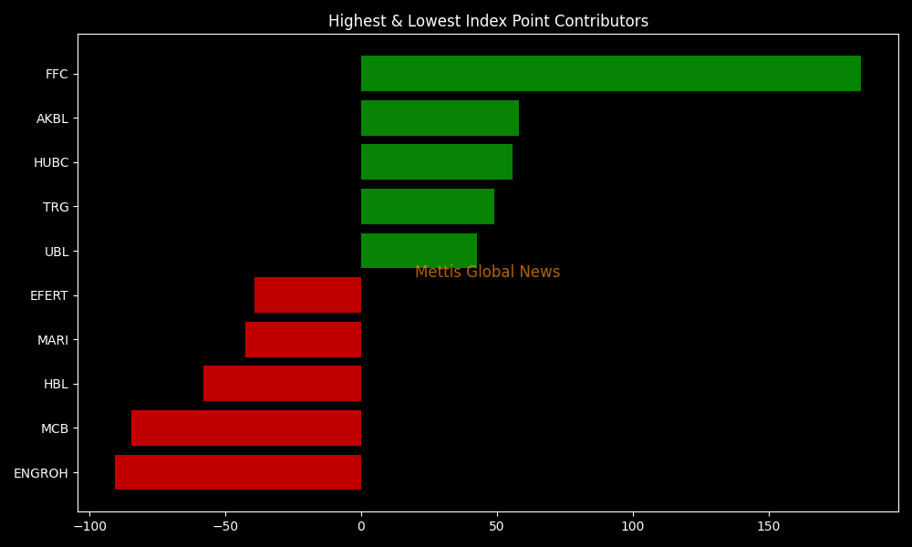 In terms of index-point contributions, companies that propped up the index were FFC (+184.12pts), AKBL (+58.12pts), HUBC (+55.82pts), TRG (+49.06pts), and UBL (+42.83pts).