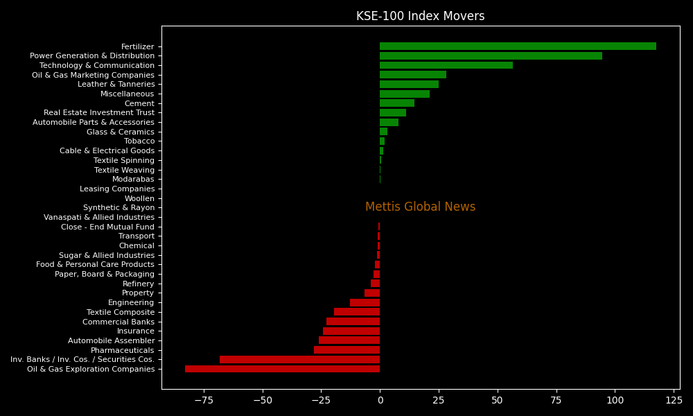 Sector-wise, KSE-100 Index was supported by Fertilizer (+117.51pts), Power Generation & Distribution (+94.45pts), Technology & Communication (+56.43pts), Oil & Gas Marketing Companies (+28.29pts), and Leather & Tanneries (+24.94pts).