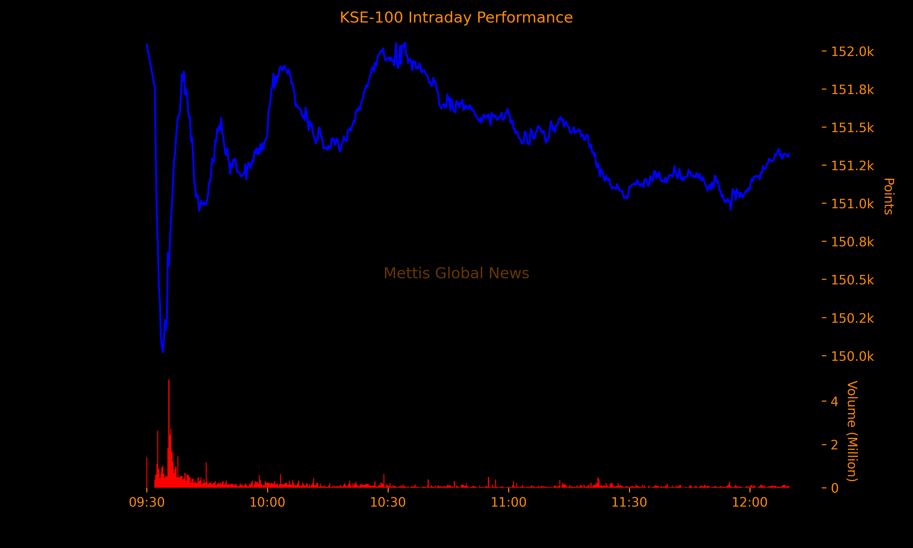 As of 12:09 PM, the KSE-100 Index was recorded at 151,291.17, down 4,220.39 points or 2.71%.
