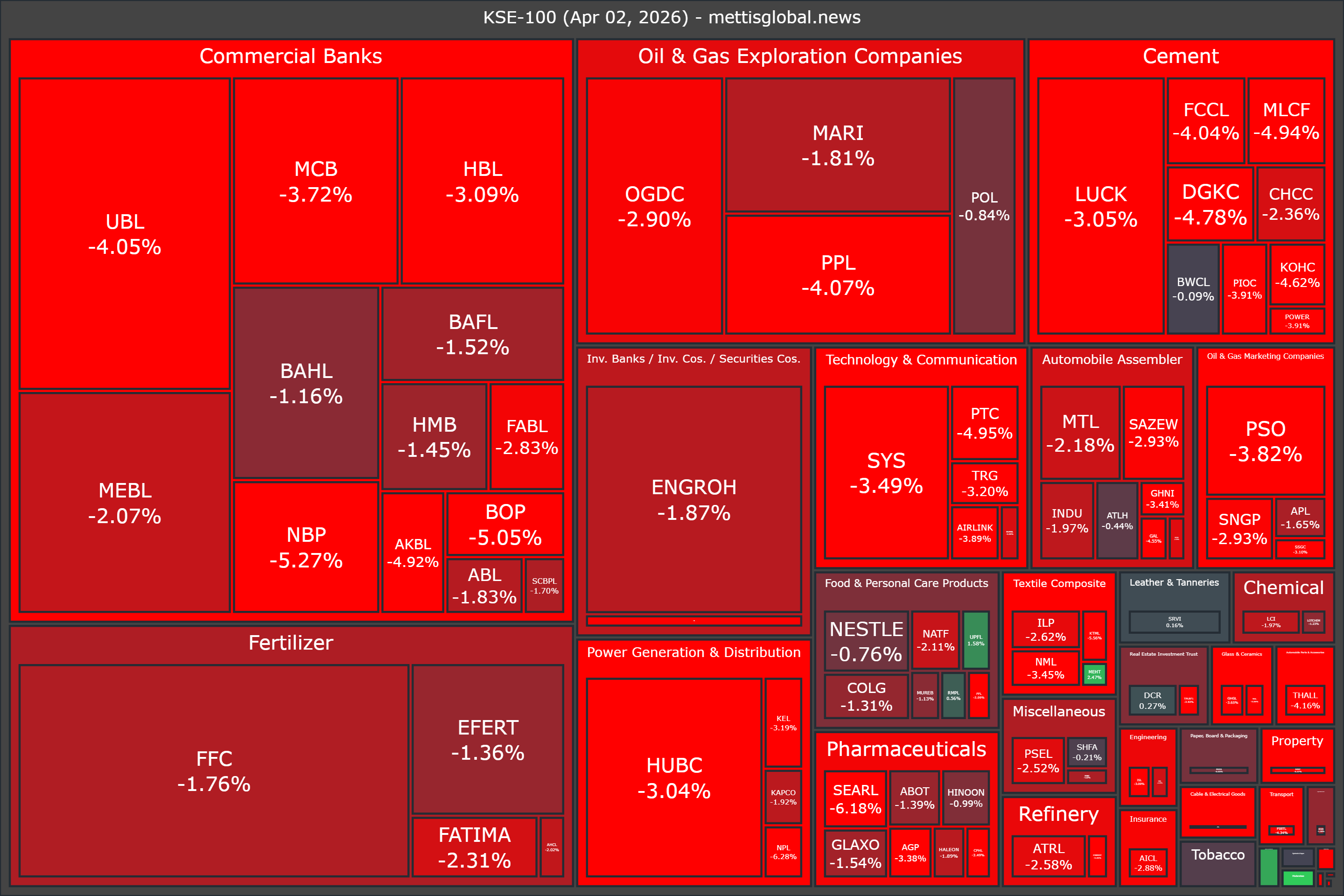 April 02, 2026 (MLN): The benchmark KSE-100 Index witnessed a sharp decline during intraday trading on Thursday, which reflects broad-based selling pressure in line with weak global cues.