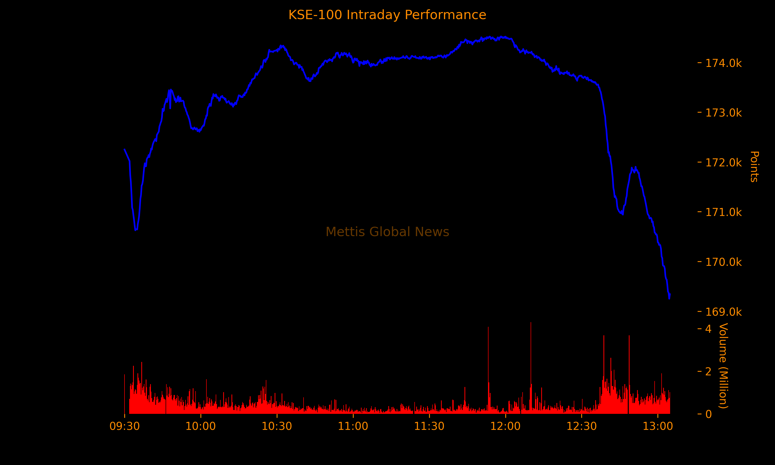 At 1:05pm, the KSE-100 Index stood at 169,341.39, down 4,597.62 points or 2.64%. The index saw extreme intraday volatility, moving between a high of 174,523.76 (+584.75 points) and a low of 169,249.57 (-4,689.44 points), reflecting heightened uncertainty and aggressive selling pressure.